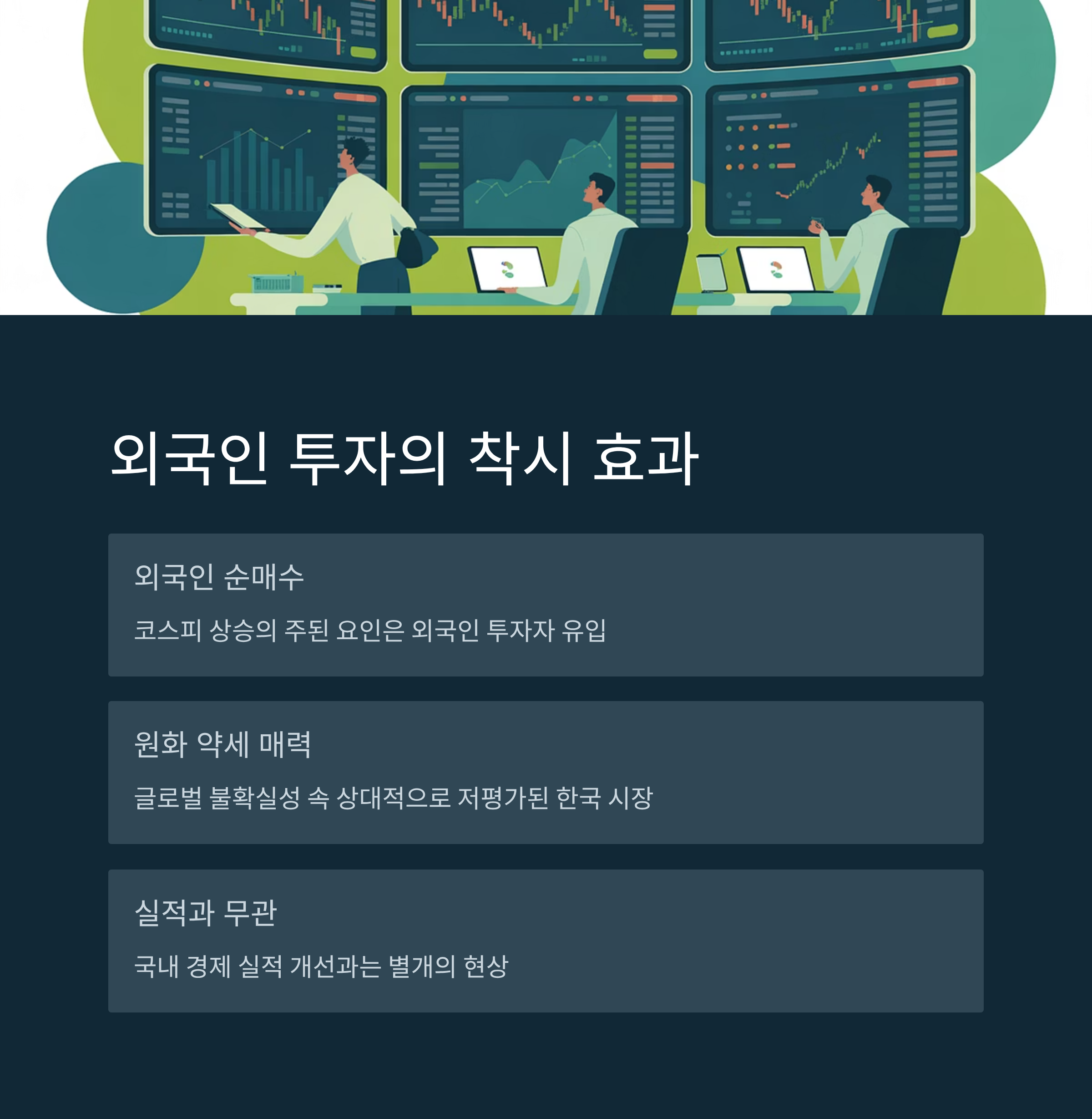 최근 코스피 상승은 주로 외국인 투자자의 유입 때문으로, 국내 경제 실적과는 무관할 수 있습니다.