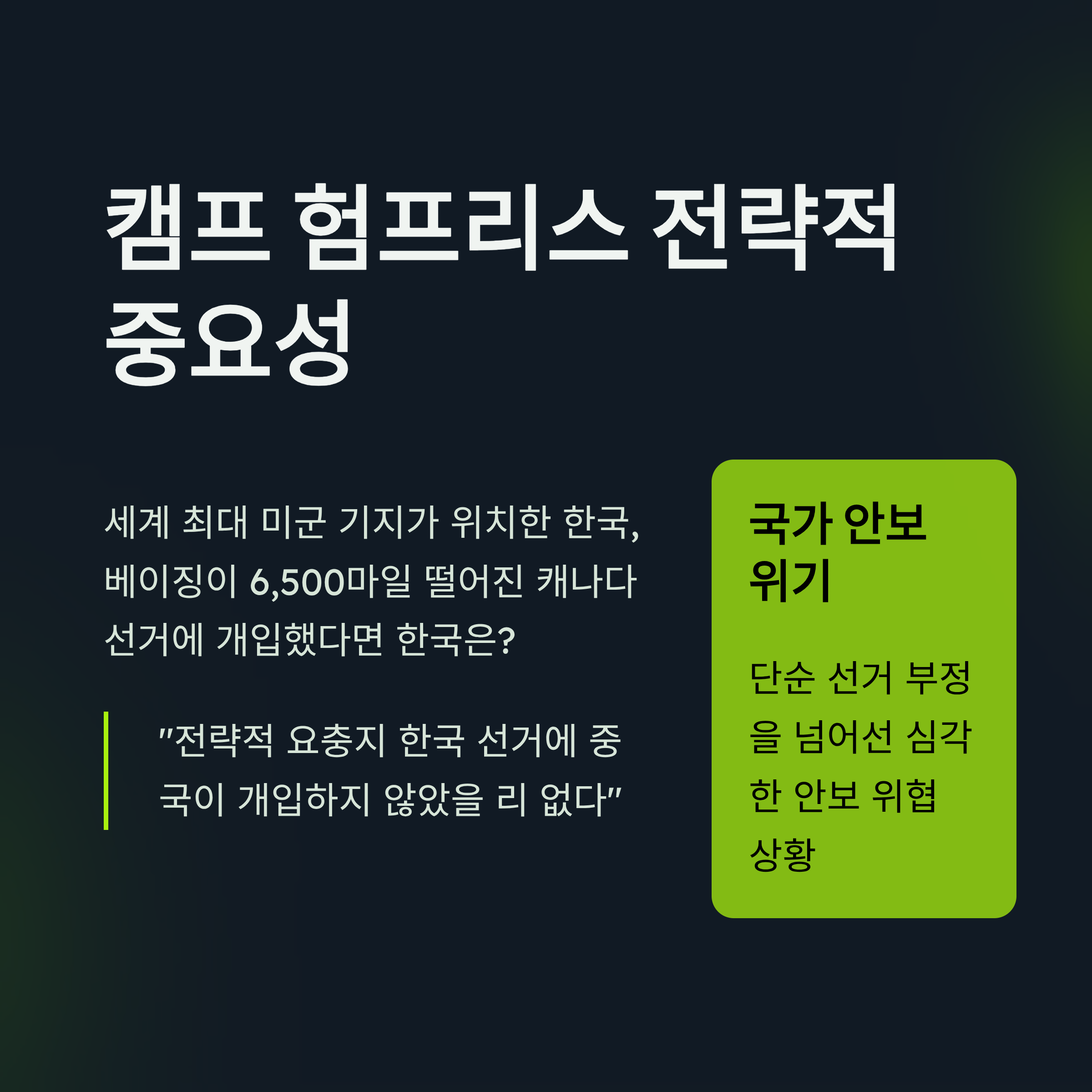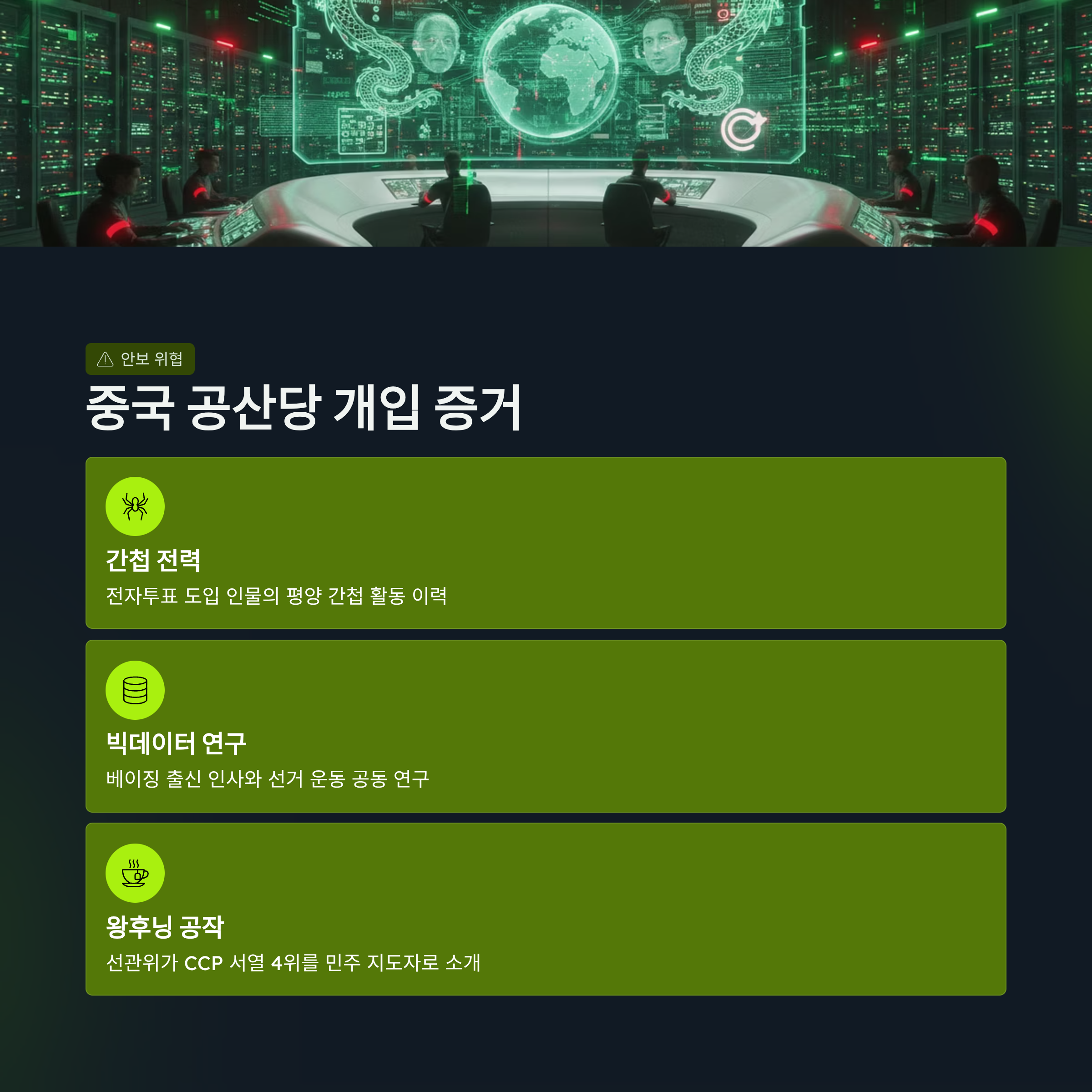 이번 기고문에서 가장 주목할 점은 중국 공산당의 직접 개입설입니다. 황 대표는 한국의 전자투표 시스템 도입 초기 인물이 평양을 위한 간첩 활동 전력이 있고, 중국 베이징 출신 인사와 빅데이터 선거 운동을 연구했다는 점을 근거로 듭니다. 특히 선관위 공식 채널에서 중국 공산당 서열 4위이자 공작 설계자인 왕후닝을 '민주 지도자'로 소개한 사실은 중국의 침투가 공공기관 깊숙이 진행되었음을 보여줍니다. 베이징이 6,500마일 떨어진 캐나다 선거에 개입했다면, 세계 최대 미군 기지인 캠프 험프리스가 위치한 전략적 요충지 한국 선거에 개입하지 않았을 리 없다는 논리는 단순한 선거 부정을 넘어 국가 안보 위기론으로 확장됩니다.