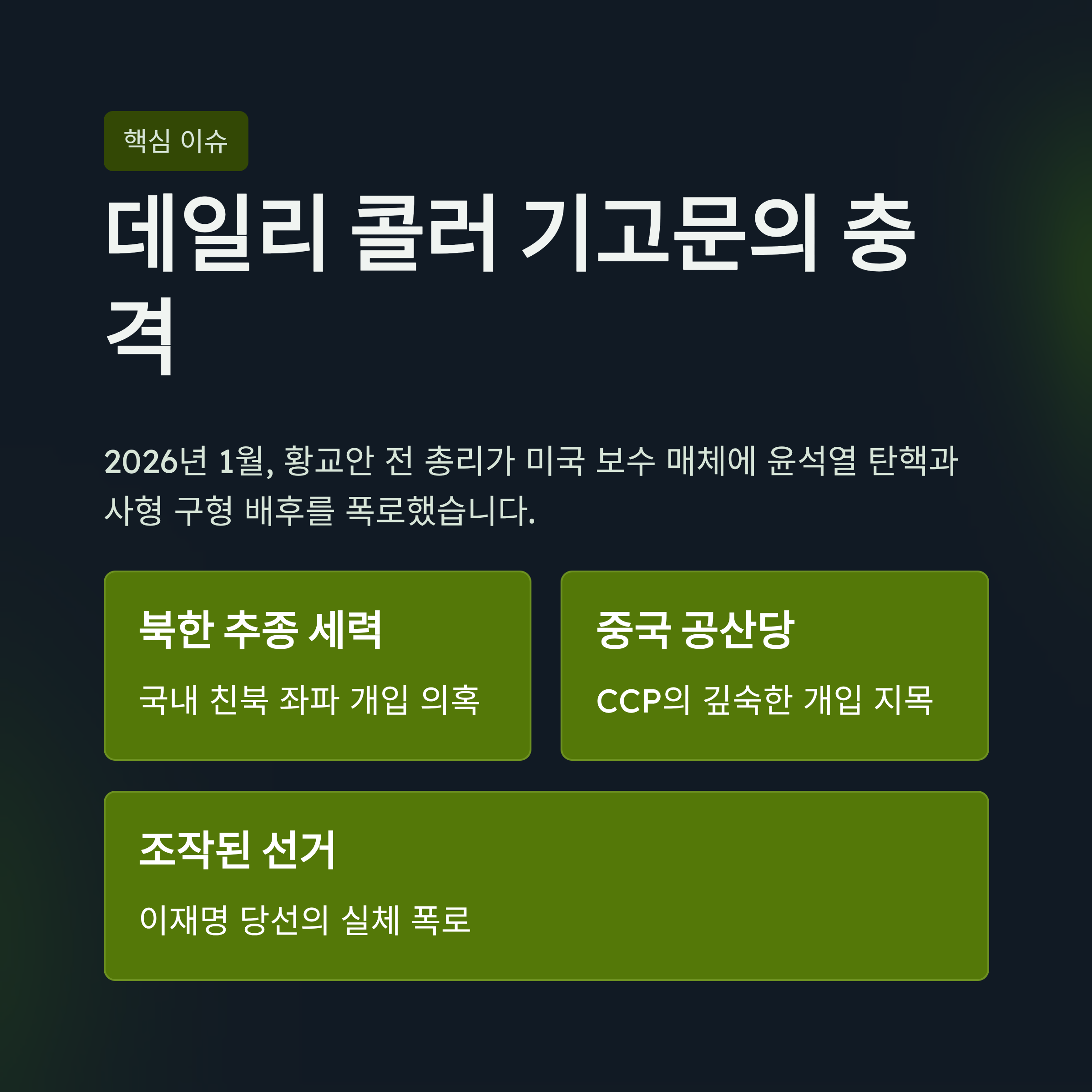 2026년 1월, 황교안 전 국무총리가 미국의 유력 보수 매체인 '데일리 콜러(The Daily Caller)'에 기고한 글이 대한민국에 큰 파장을 일으키고 있습니다. 황 전 총리는 기고문을 통해 윤석열 전 대통령의 탄핵과 구속, 그리고 사형 구형이라는 초유의 사태 배후에 북한 추종 세력과 중국 공산당(CCP)이 깊숙이 개입되어 있다고 주장했습니다. 또한, 현재 이재명 대통령 정부 하에서 벌어지고 있는 일련의 정치적 상황이 조작된 선거와 밀접하게 연관되어 있음을 강력히 피력했습니다. 본 글에서는 황교안 대표가 제기한 한국 선거의 무결성 훼손 문제, 사법부의 비호 의혹, 그리고 국제적인 선거 조작 카르텔의 실체를 심층적으로 분석하고, 트럼프 미 행정부의 조사와 연계된 향후 전망을 다루고자 합니다.