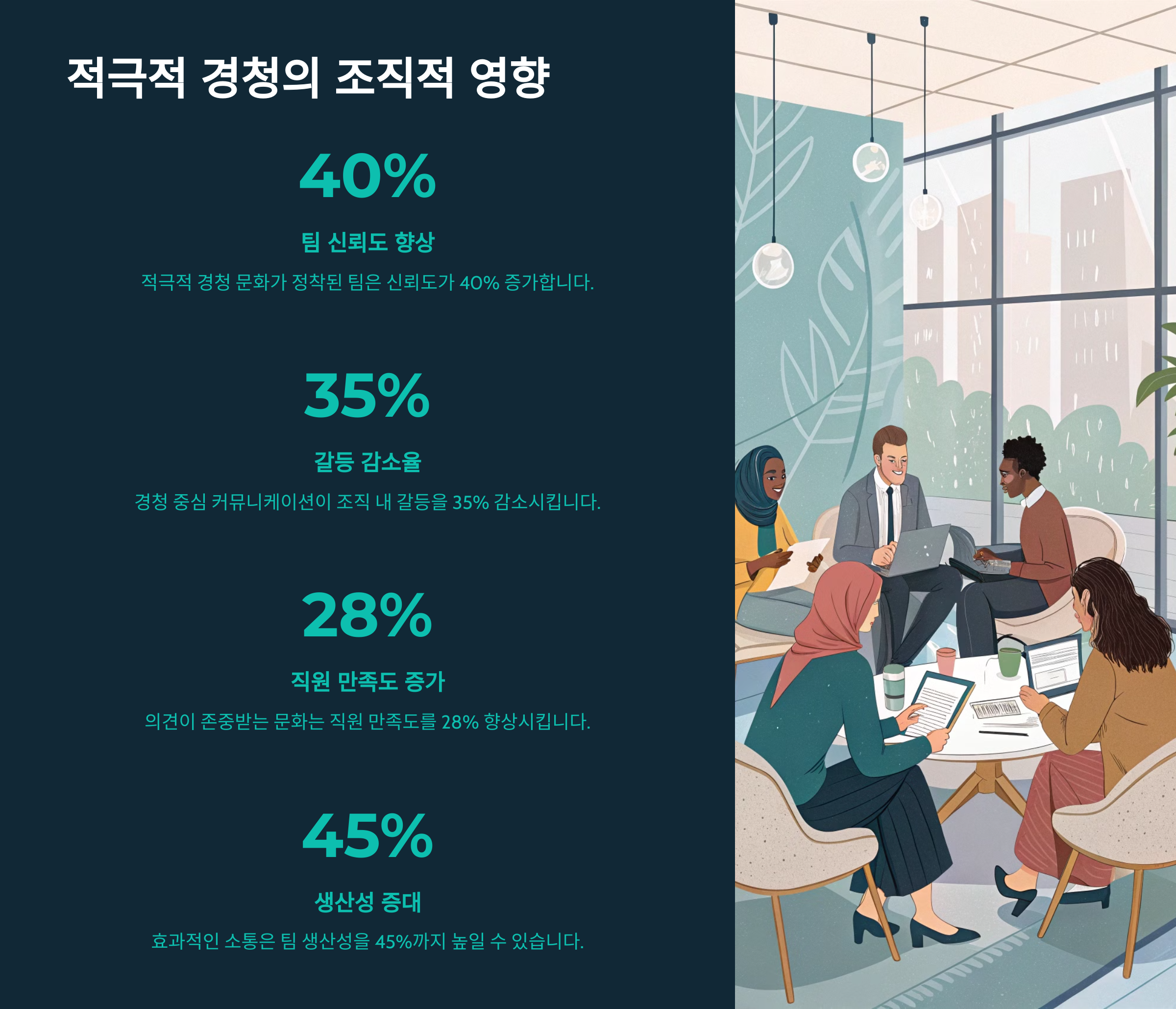 - 적극적 경청의 효과: 신뢰 형성, 갈등 해소, 팀워크 향상 등 조직 문화에 미치는 긍정적 영향 분석