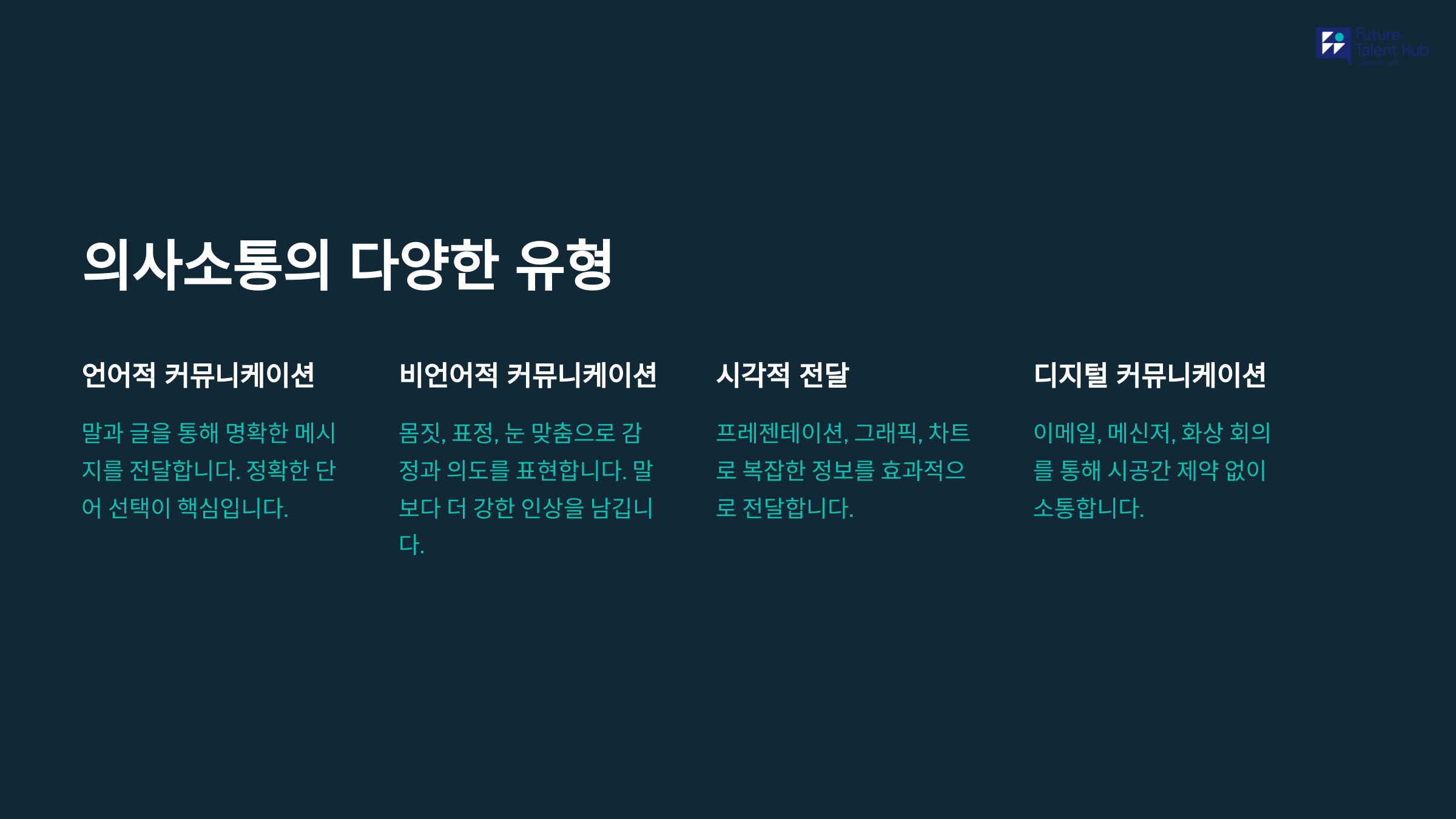 - 주요 스킬 유형: 적극적 경청, 언어적·비언어적 커뮤니케이션, 서면·시각적 전달 등 다양한 스킬 소개