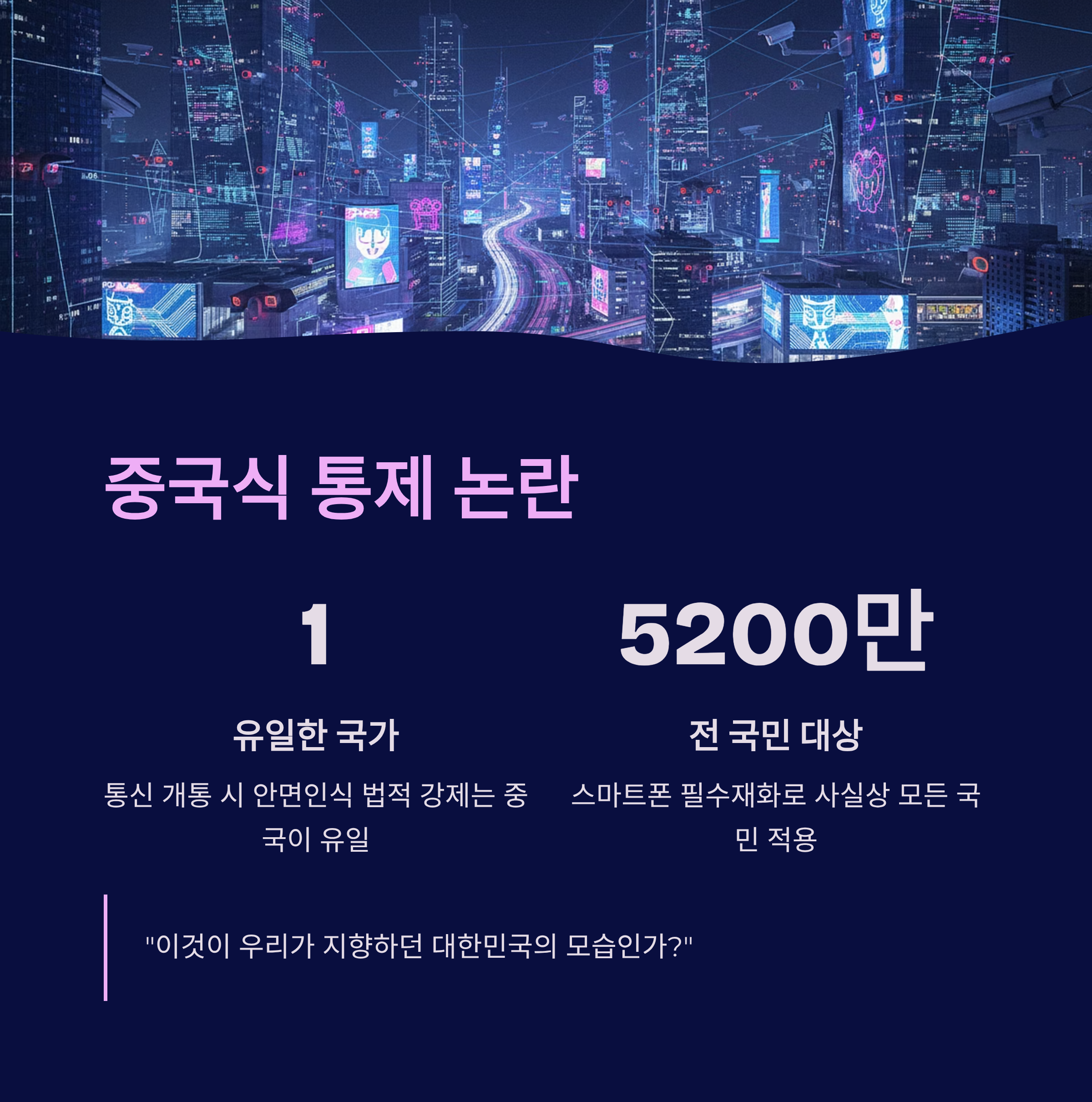 국가 감시 우려: 전 세계적으로 통신 개통 시 안면인식을 강제하는 국가는 중국이 유일합니다. 이는 한국이 중국식 통제 사회로 가는 것이 아니냐는 합리적인 의심을 불러일으킵니다.