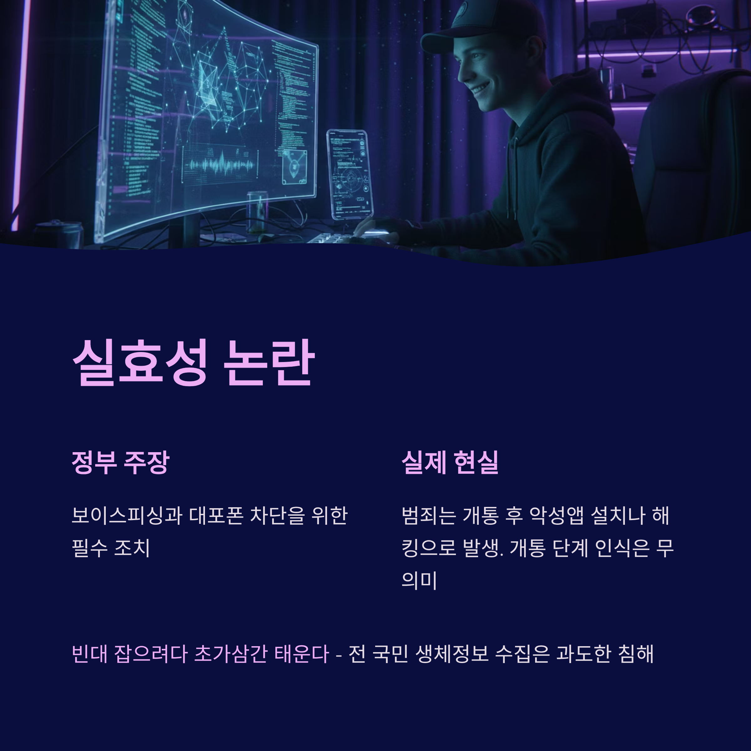 | A. 일부 대포폰 개통을 어렵게 할 수는 있으나, 보이스피싱의 주된 수법인 '개통 후 해킹'이나 '원격 제어 앱 설치'를 막는 데는 한계가 있습니다. 실질적인 범죄 예방 효과에 비해 전 국민의 생체 정보를 수집하는 리스크가 지나치게 크다는 지적이 있습니다. |