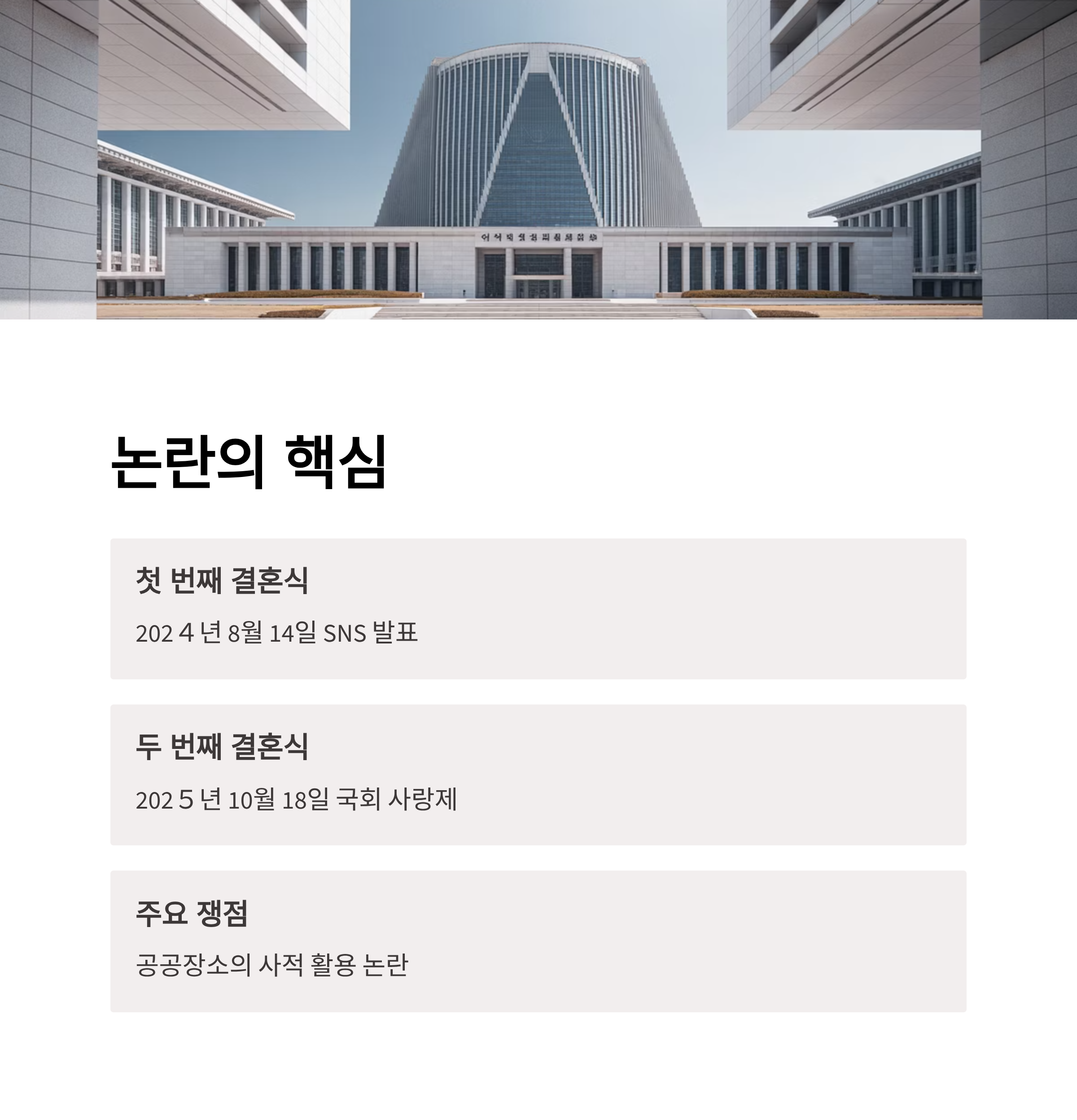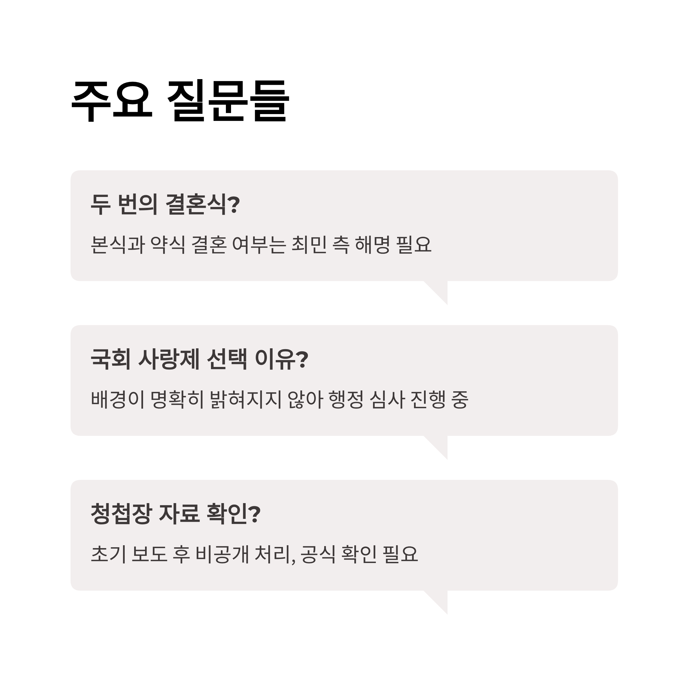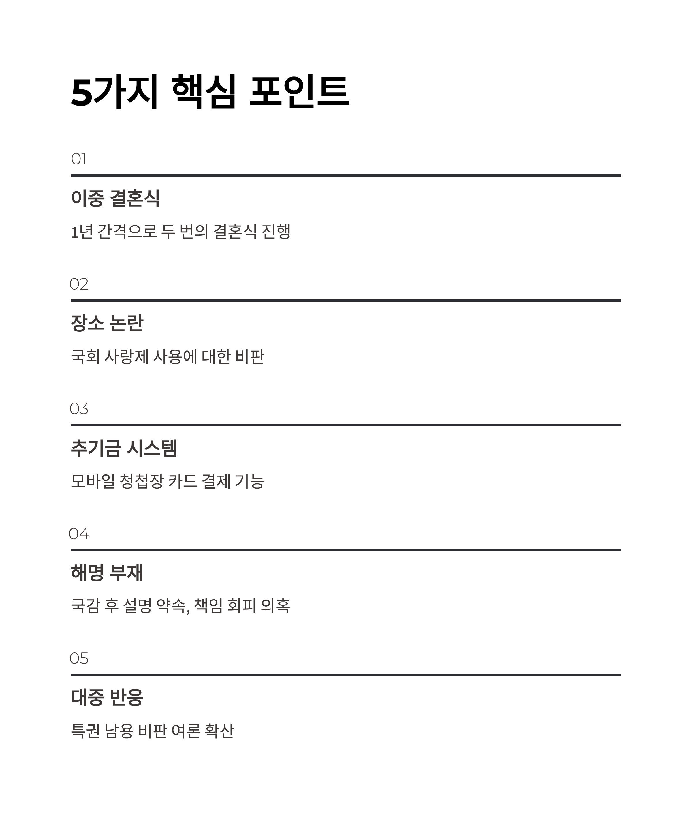 이번 논란에서 핵심은 최민이 국회의장이라는 지위를 사적인 목적에 사용했는지의 여부입니다. 국회 사랑제라는 공공의 의미가 강한 장소에서 개인적인 결혼식이 열렸으며, 대중의 시각으로는 이를 특권 남용으로 바라볼 위험성이 큽니다. 추가로 축의금 관련 논란과 1년 이상 차이난 두 번의 결혼식 사이의 관계성도 이해가 요구됩니다.