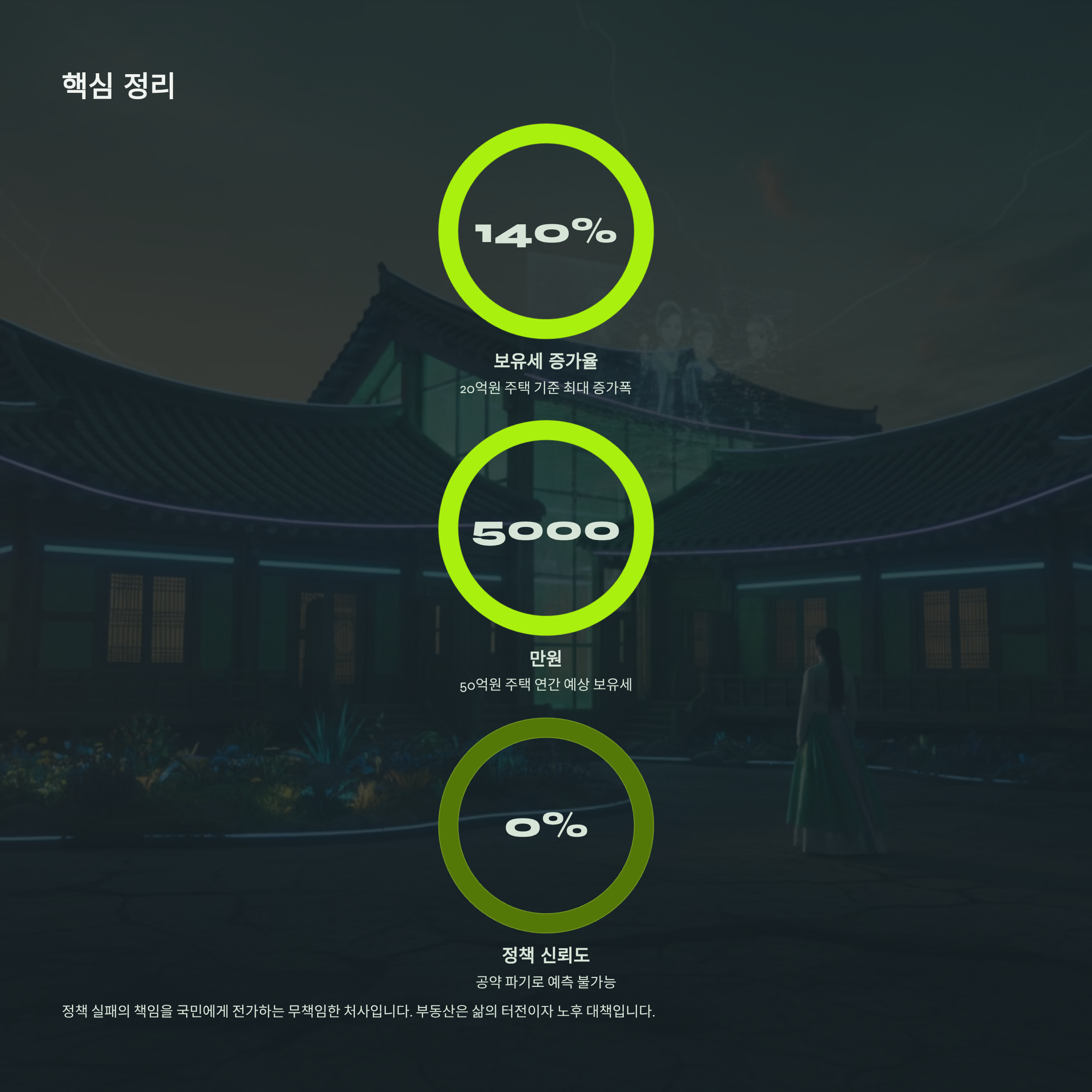 요약하자면, 현재 이재명 정부가 시사하는 1주택자 보유세 강화 방안은 정책 실패의 책임을 국민에게 전가하는 무책임한 처사입니다. 집값은 정부의 설익은 규제로 올려놓고, 그 상승분을 근거로 실거주자에게 징벌적 세금을 매기는 것은 조세 형평성에도 어긋나며 국민의 재산권을 과도하게 침해합니다.