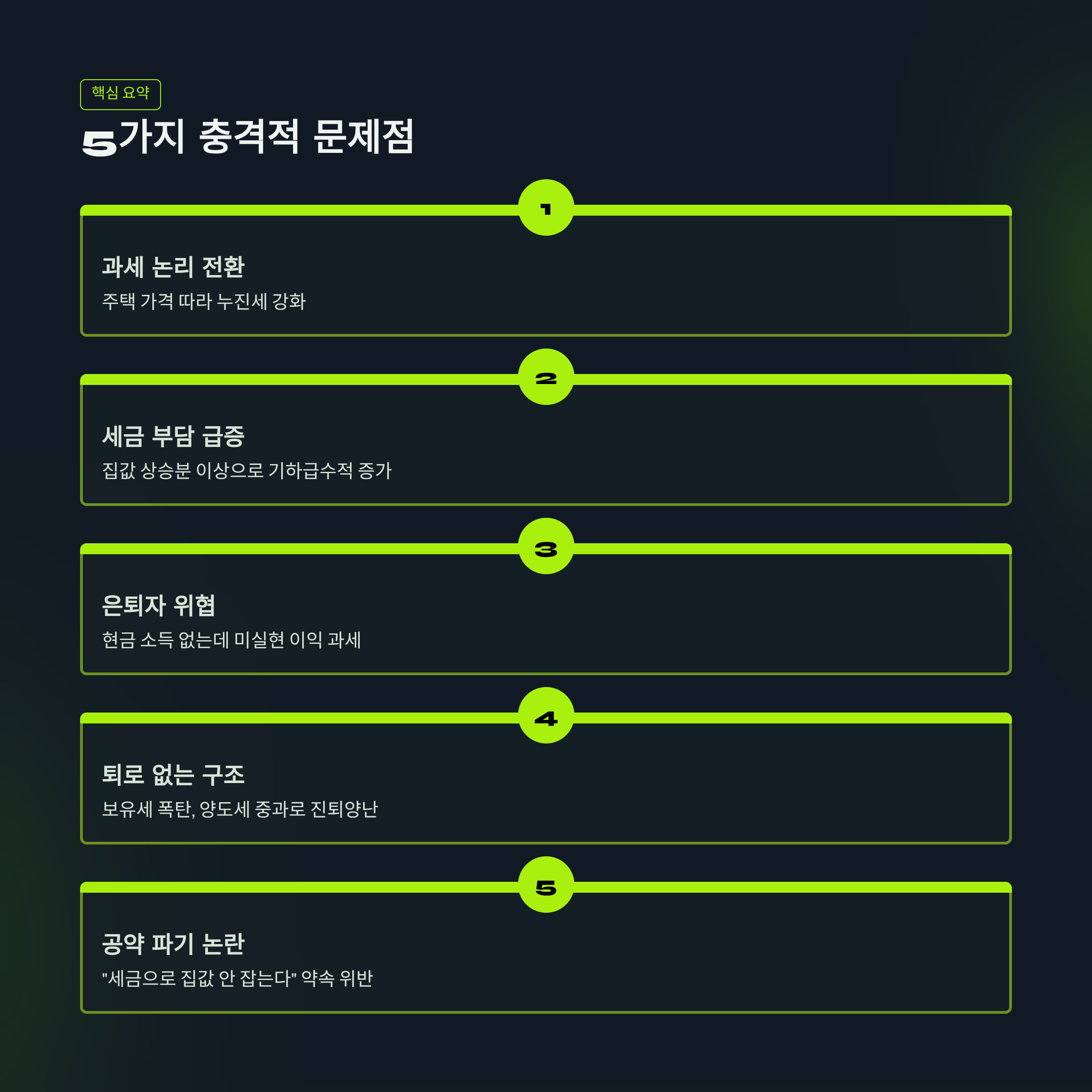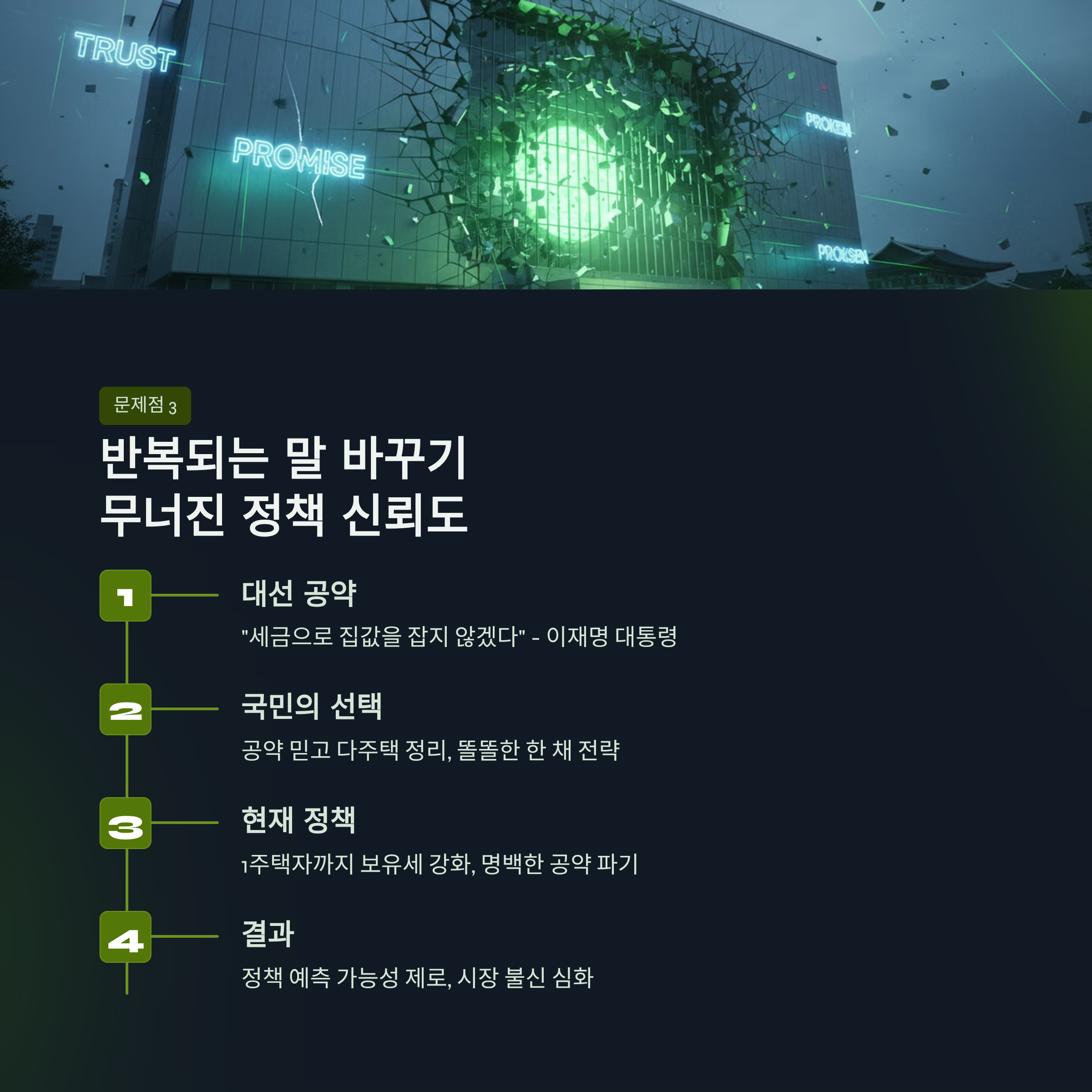 - 공약 파기 논란: 세금으로 집값을 잡지 않겠다던 이재명 대통령의 대선 공약과 정면으로 배치되어 정책 신뢰도가 붕괴되고 있습니다.