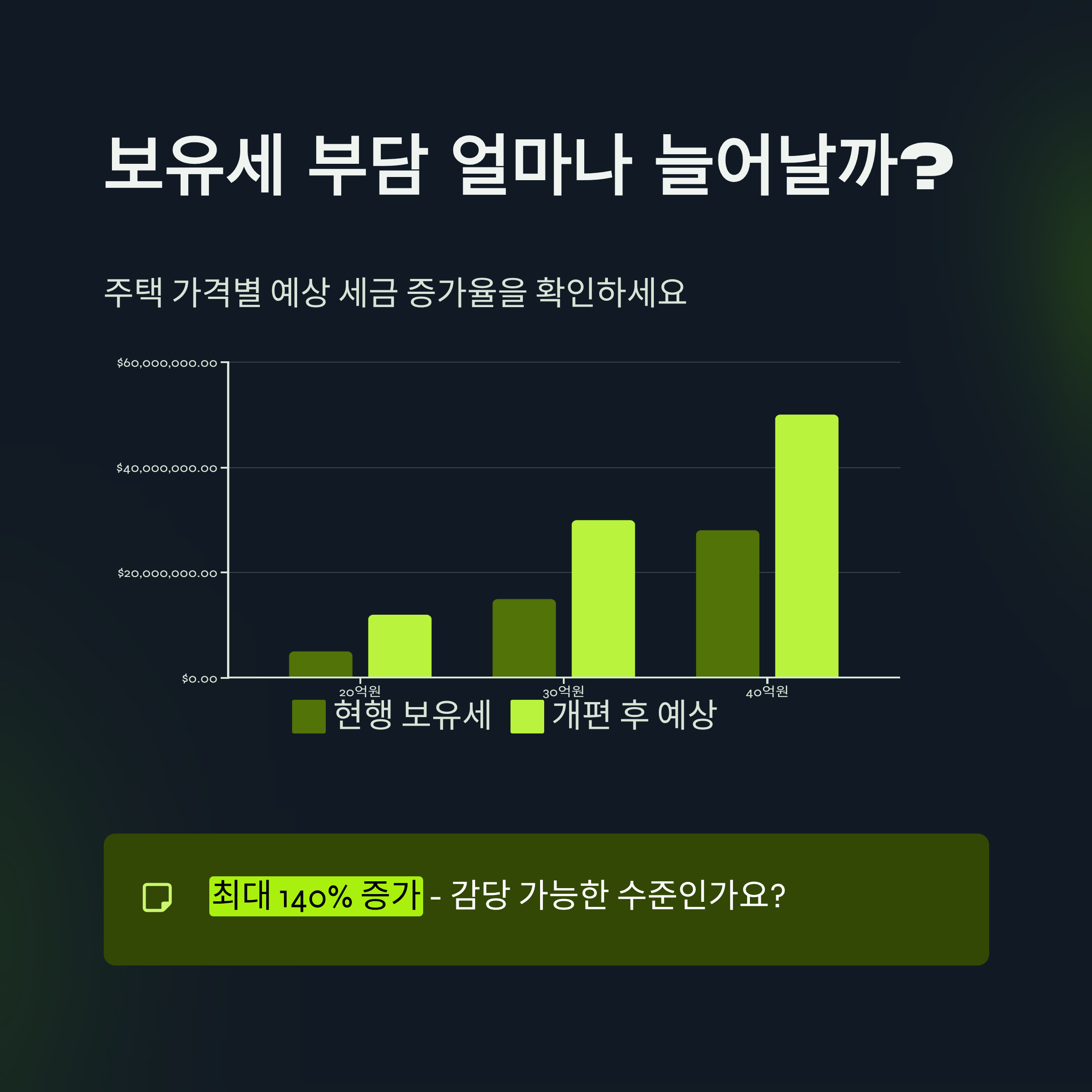 | 주택 가격 | 현행 보유세 (예시) | 개편 후 예상 보유세 (예시) | 부담 증가율 |
