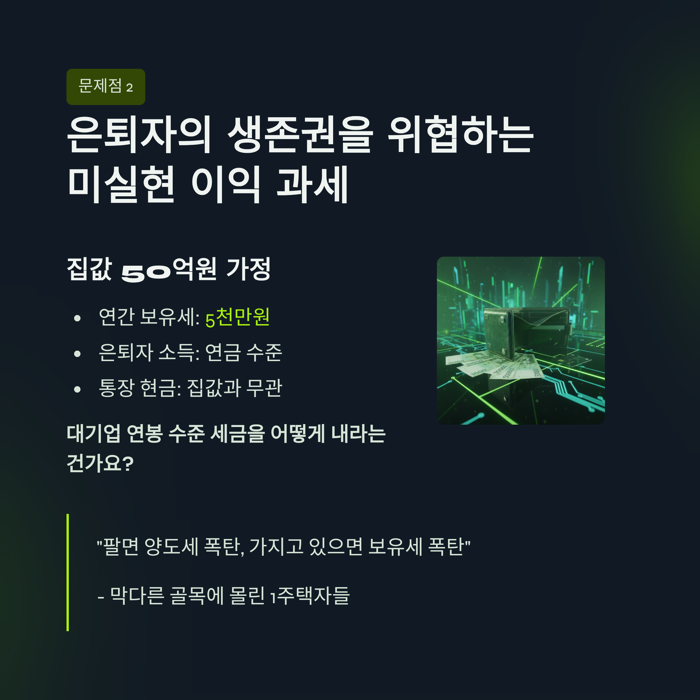 - 소득 없는 실거주자 위협: 현금 소득이 없는 은퇴자에게 미실현 이익에 대한 과도한 세금을 부과해 사실상 거주 이전을 강요합니다.