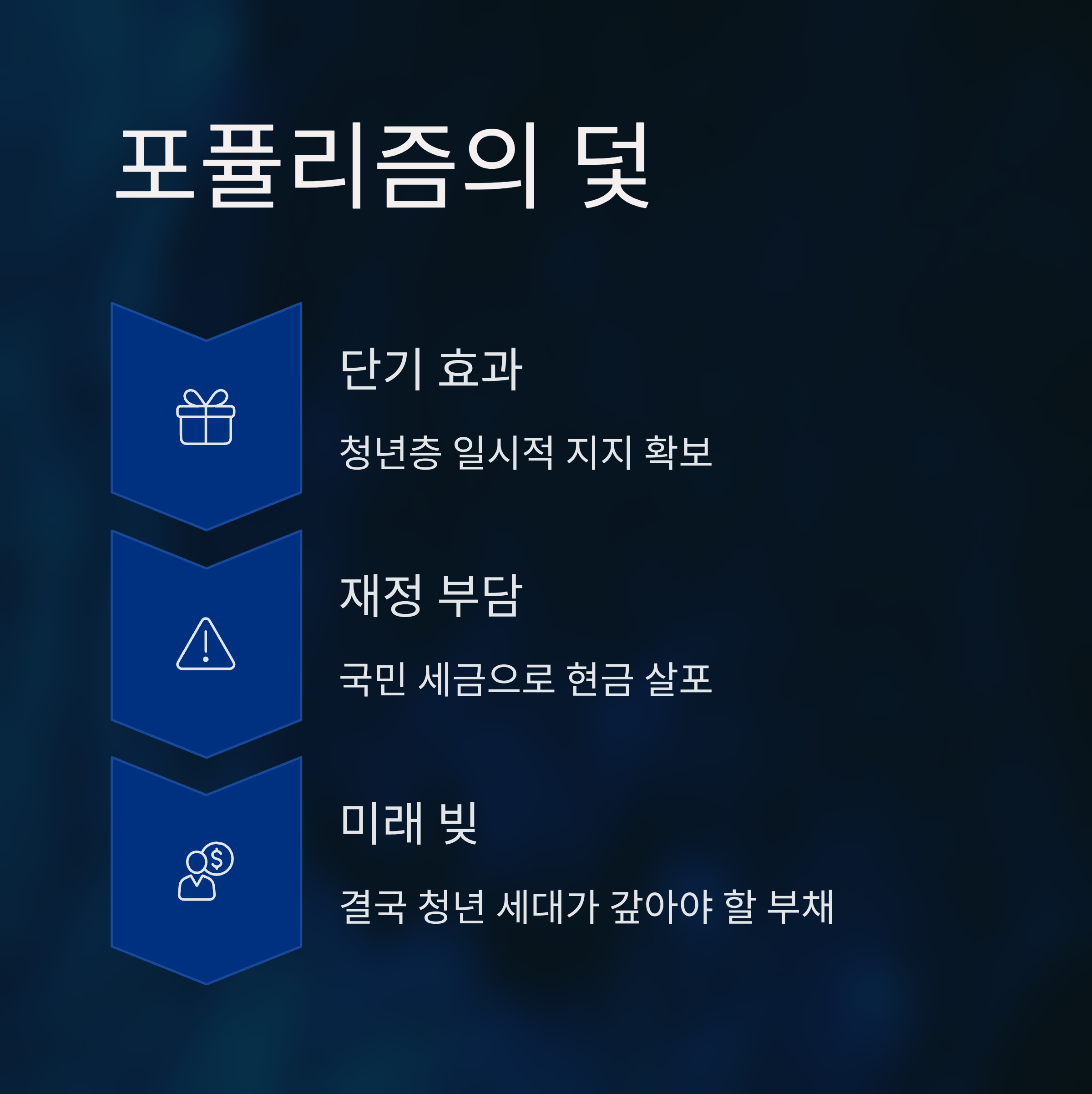 김 전 부원장이 '100만 원' 지급을 언급한 맥락은 포퓰리즘이 어떻게 국가의 핵심 정책으로 자리 잡았는지를 단적으로 드러냅니다. 청년 배당 같은 현금 복지 정책은 단기적으로는 청년층의 지지를 얻을 수 있지만, 재정적 지속 가능성과 사회적 부작용을 동반합니다. 이와 같은 직접적인 현금 살포 정책은 국민의 세금으로 이루어지며, 결과적으로 미래 세대에게 재정 부담을 전가하는 구조를 만들어냅니다. 이는 단순한 경제적 접근에서 벗어나 장기적이며 지속 가능한 정책이 요구되는 시점에서 부적절한 선택입니다.