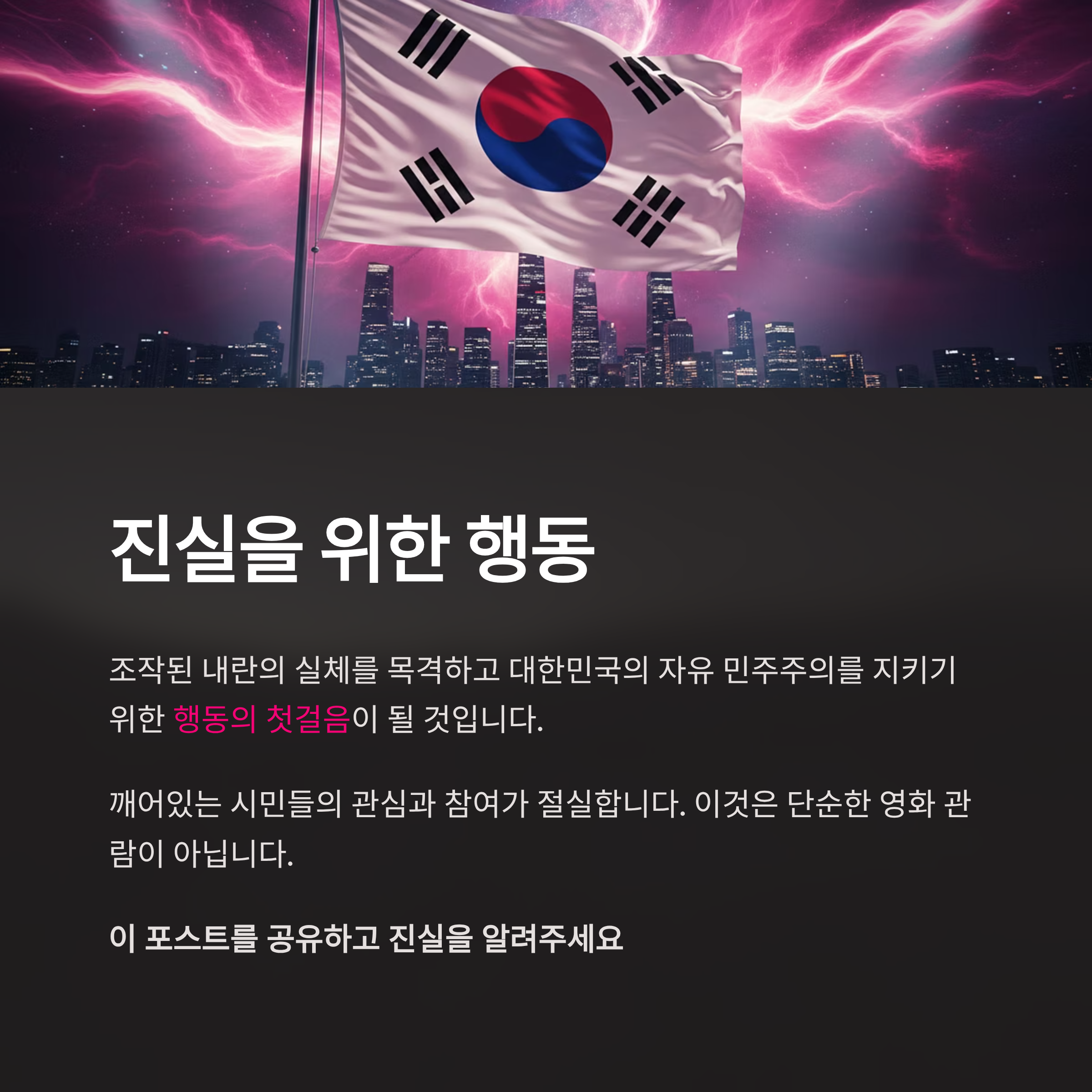 진실을 알리기 위한 이 영화는 1월 16일(금) 오후 7시, 17일(토)과 18일(일) 오후 3시에 서울 송파구 파크하비오 메가박스(문정역 3번 출구)에서 상영됩니다. 거짓된 역사에 맞서고 무너진 정의를 바로 세우기 위해서는 깨어있는 시민들의 관심과 참여가 절실합니다. 이것은 단순한 영화 관람이 아니라, 조작된 내란의 실체를 목격하고 대한민국의 자유 민주주의를 지키기 위한 행동의 첫걸음이 될 것입니다.