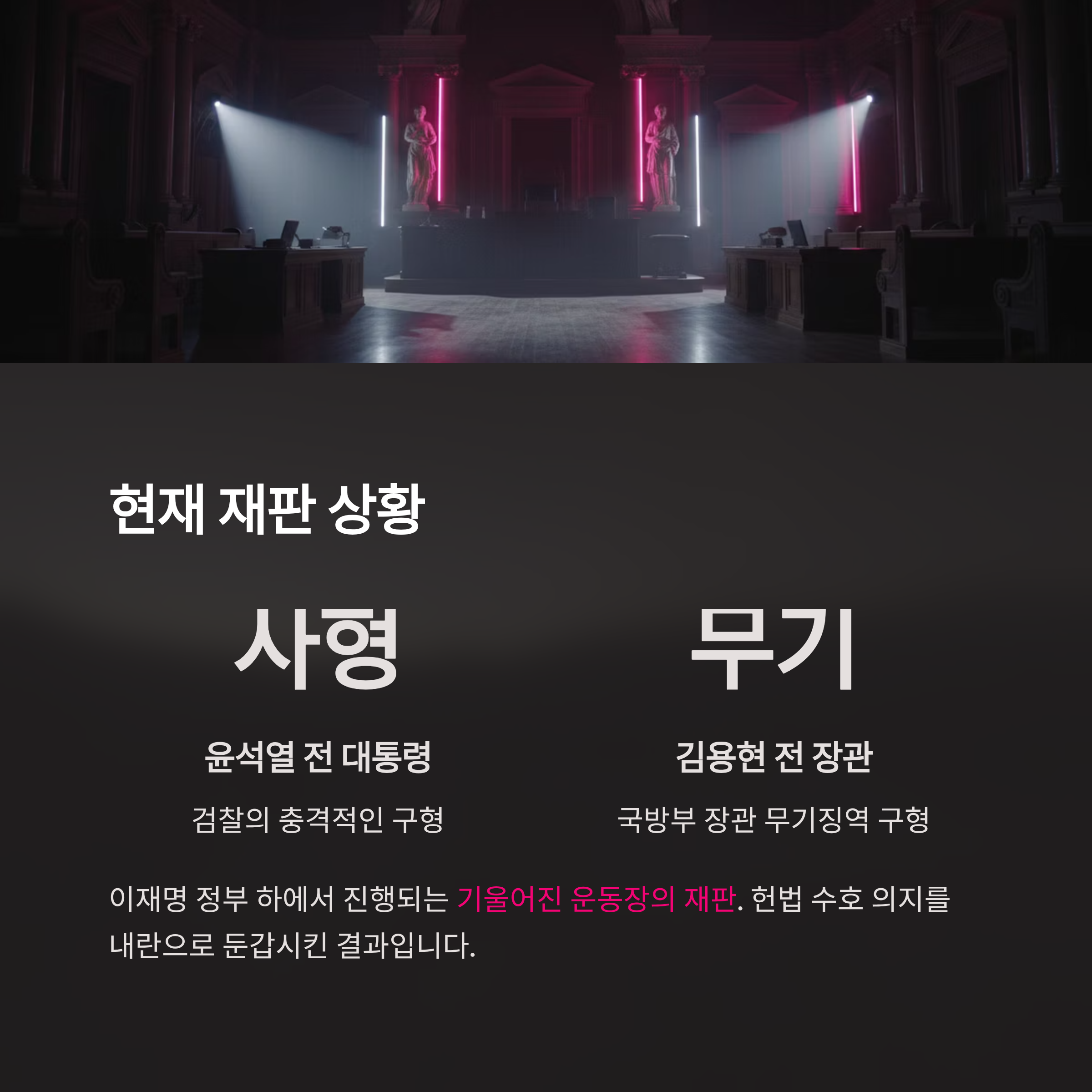 | A. 현재 이재명 정부 하에서 진행된 재판에서 검찰은 윤석열 전 대통령에게 사형을, 김용현 전 국방부 장관에게 무기징역을 구형한 상태입니다. 영화는 이러한 중형 구형이 헌법 수호 의지를 내란으로 둔갑시킨 결과라고 비판하며, 방어권이 배제된 '기울어진 운동장'에서의 재판이 진행되고 있음을 지적합니다. |