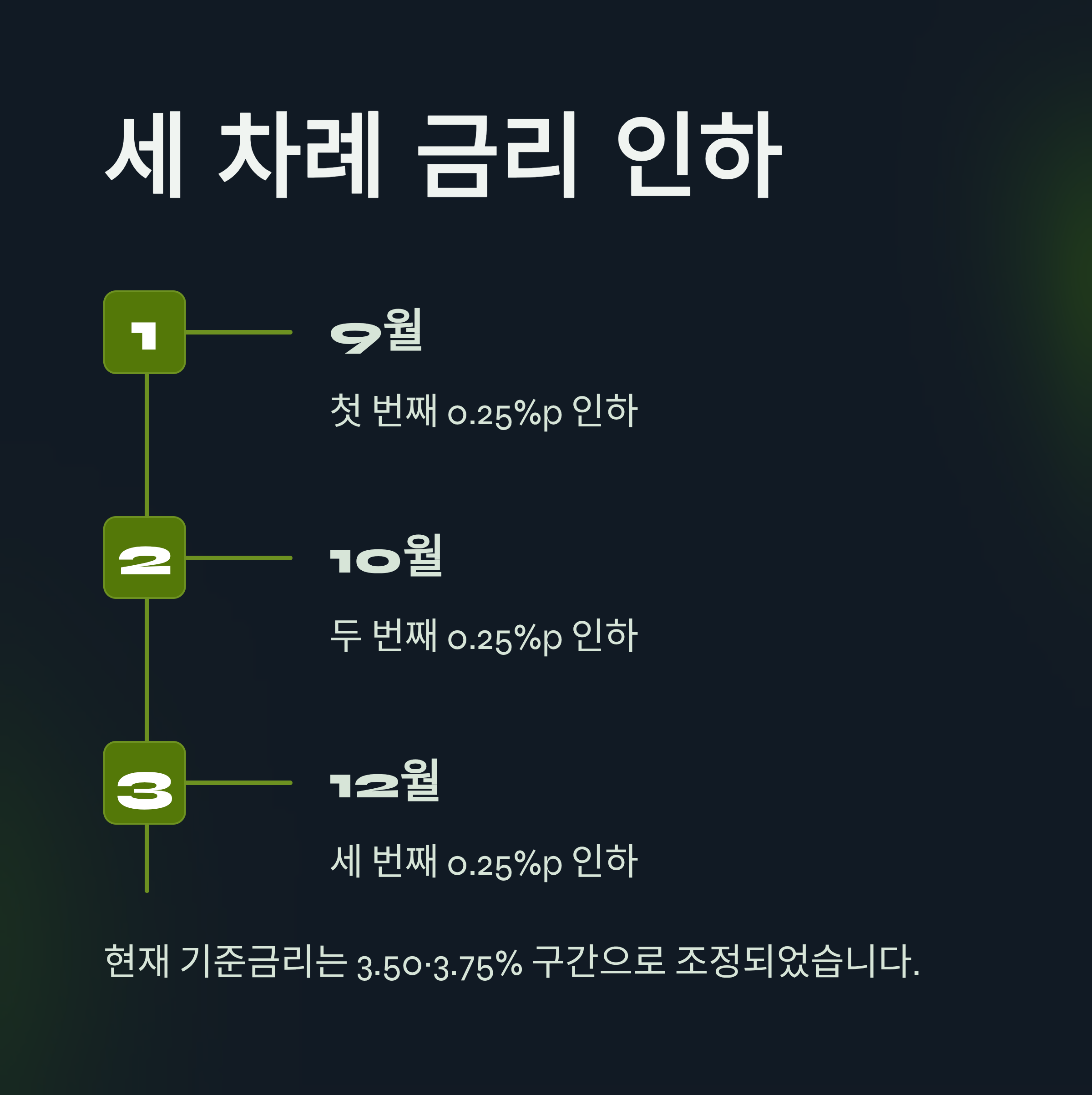 미국 연준은 2025년 9월, 10월, 12월에 걸쳐 0.25%포인트씩 기준금리를 인하했습니다. 현재 금리는 3.50~3.75%입니다.