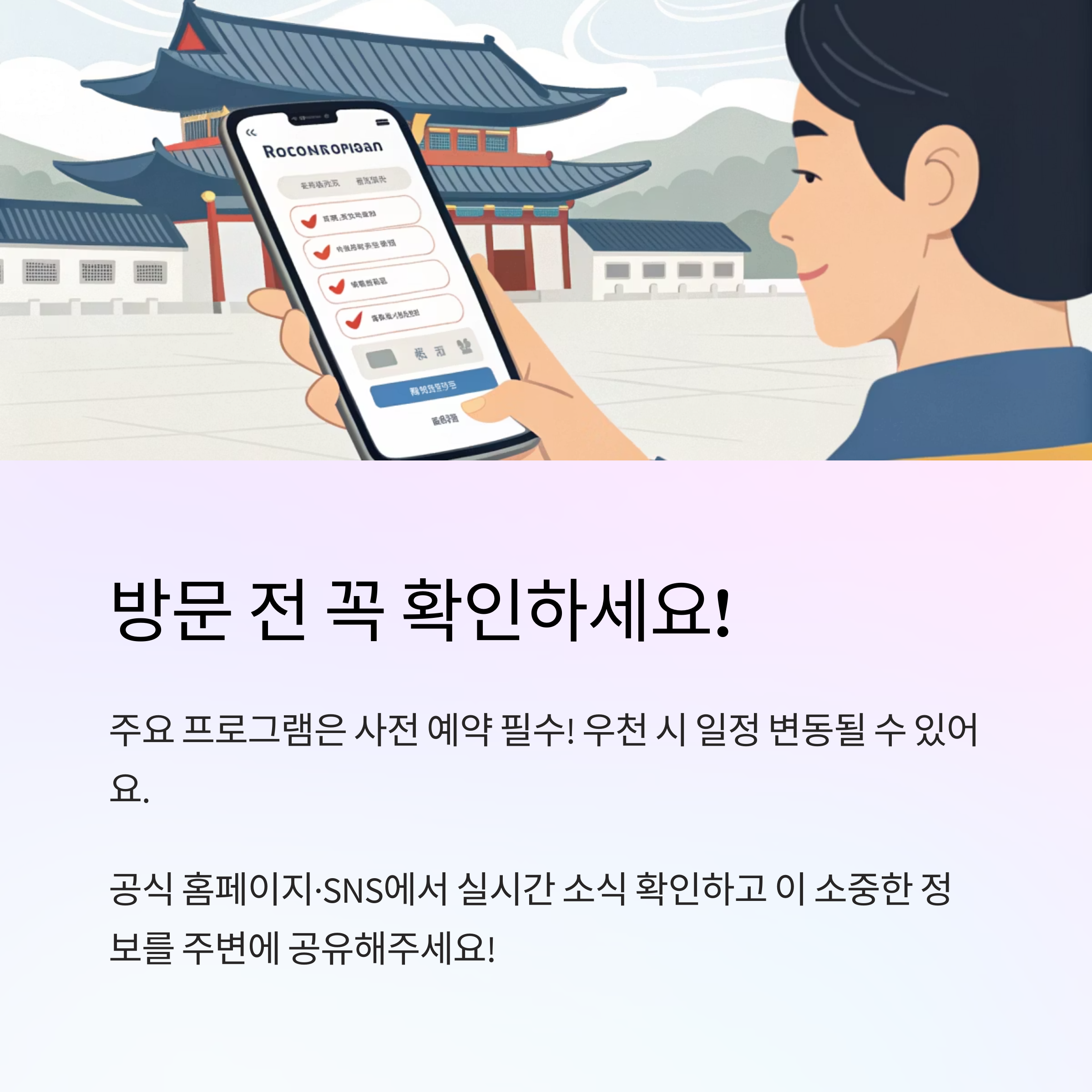 사전 예약은 필수이며, 궁별 프로그램 일정 및 시간 확인이 필요하니 꼭 사전에 계획을 세우시길 권장합니다.