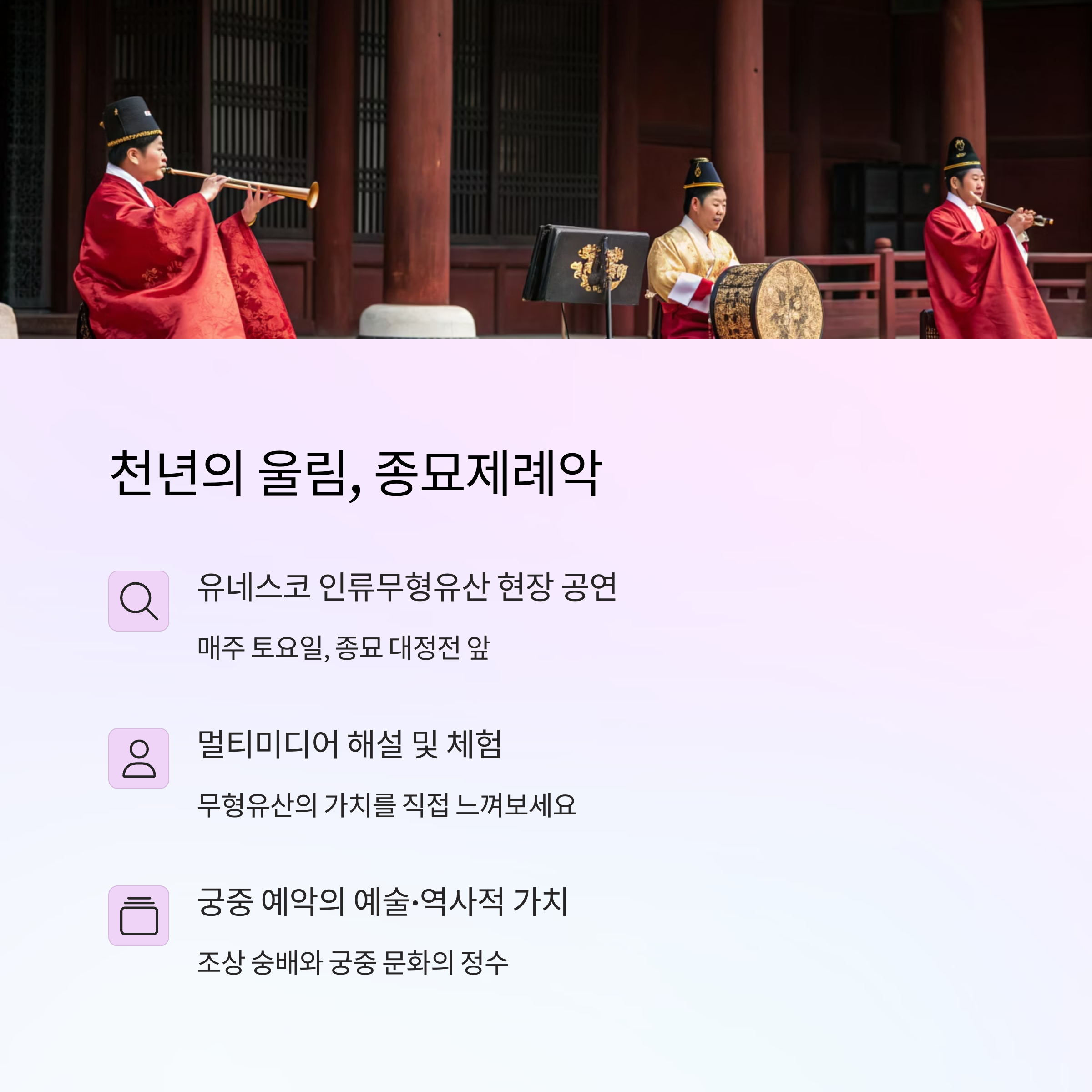 유네스코가 선정한 종묘 제례악은 국내외 관광객들에게 한국의 전통 음악적 가치를 알리는 가장 대표적 공연 중 하나입니다.