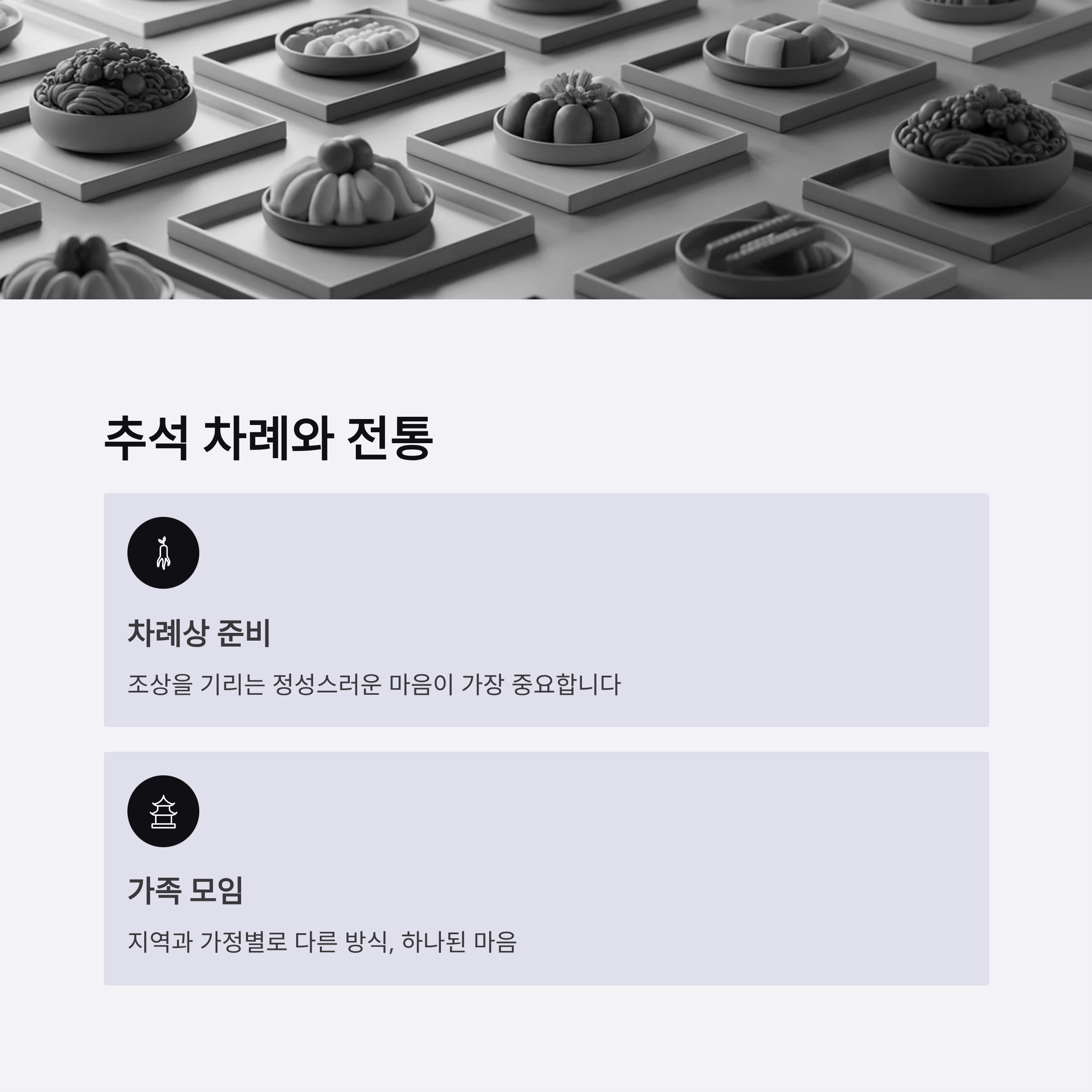 추석 아침에는 조상을 기리는 차례가 진행됩니다. 지역과 가정별로 준비 방식은 다르지만, 정성과 가족의 마음이 가장 중요합니다.
