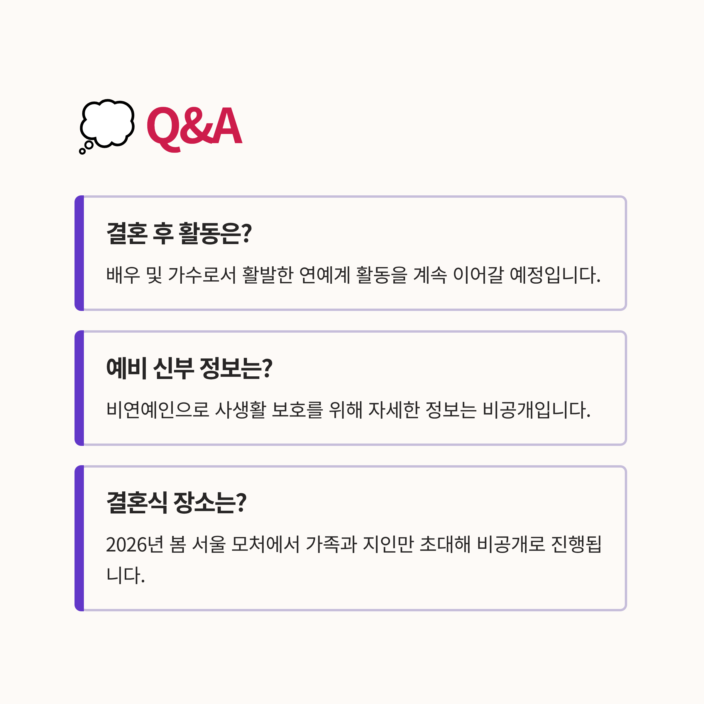 | A. 결혼식은 2026년 봄, 서울 모처에서 가족과 가까운 지인만을 초대해 비공개로 진행될 예정입니다. |
