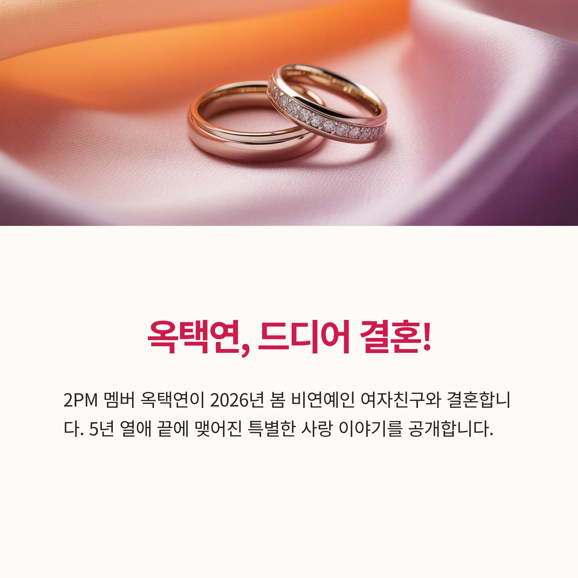 2025년 11월, 2PM 멤버이자 배우로 활발한 활동을 이어오고 있는 옥택연이 결혼 소식을 전하며 연예계와 팬들에게 큰 화제를 모았습니다. 그동안 개인적인 연애와 프라이버시를 잘 지켜온 그는, 오래된 연인과 인생의 새 출발을 결심했다고 밝혔습니다. 특히 비연예인 여자친구와의 오랜 사랑 이야기는 많은 이들에게 감동을 선사하며, 결혼식 발표로 인해 다시금 주목받고 있습니다. 이번 글에서는 옥택연의 결혼 발표와 그 배경, 특별한 러브스토리와 함께 결혼에 얽힌 다양한 정보를 정리해보겠습니다.