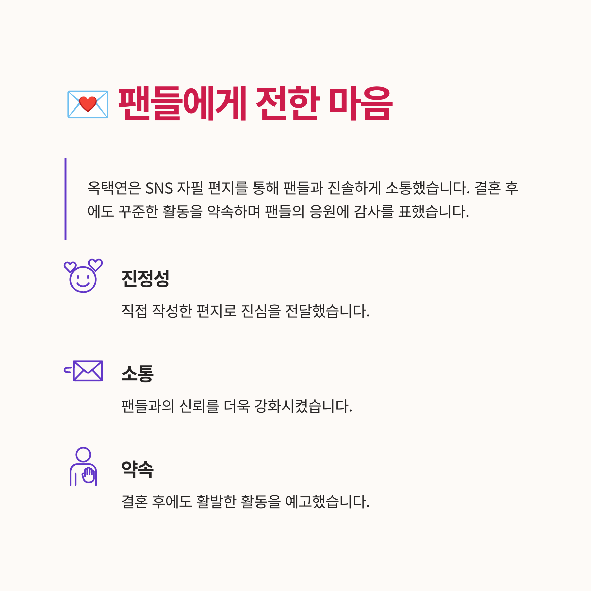 옥택연은 SNS 자필 편지를 통해 팬들에게 직접 결혼 소식을 알렸습니다. 이는 팬들과의 진솔한 소통을 중시하는 스타의 접근 방식으로 볼 수 있으며, 이러한 선택이 팬들로부터 긍정적인 반응을 이끌어냈습니다. 특히 결혼 소식을 비공식적인 루머 형태로 아니라 명확한 형태로 발표하면서, 팬들과의 신뢰를 더욱 강화시키는 결과를 만들었습니다.