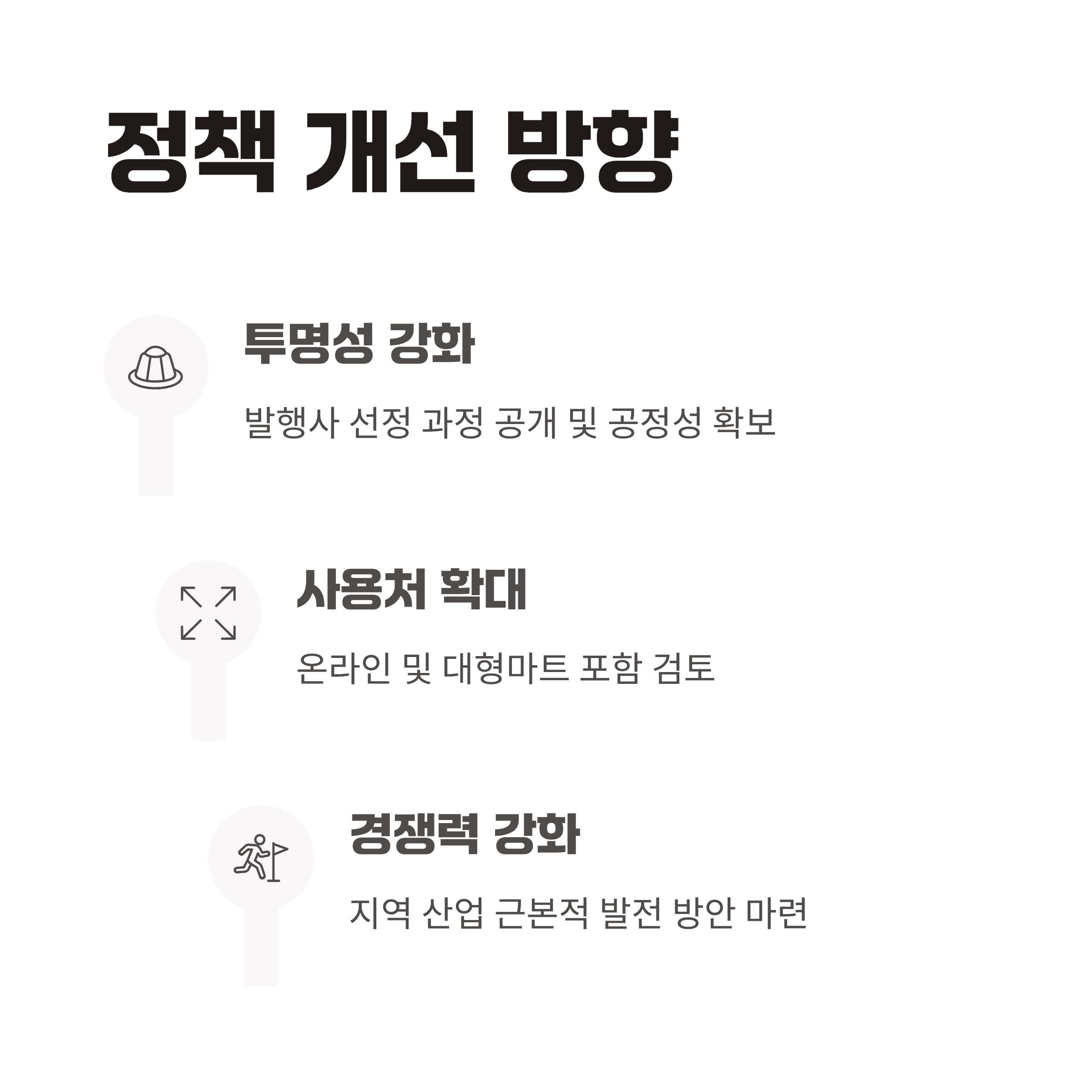 | A. 공정한 지역화폐 발행 구조, 사용처 확대, 지역 산업 경쟁력 강화, 투명한 세금 집행 등을 포함한 다각적 접근이 필요합니다. |