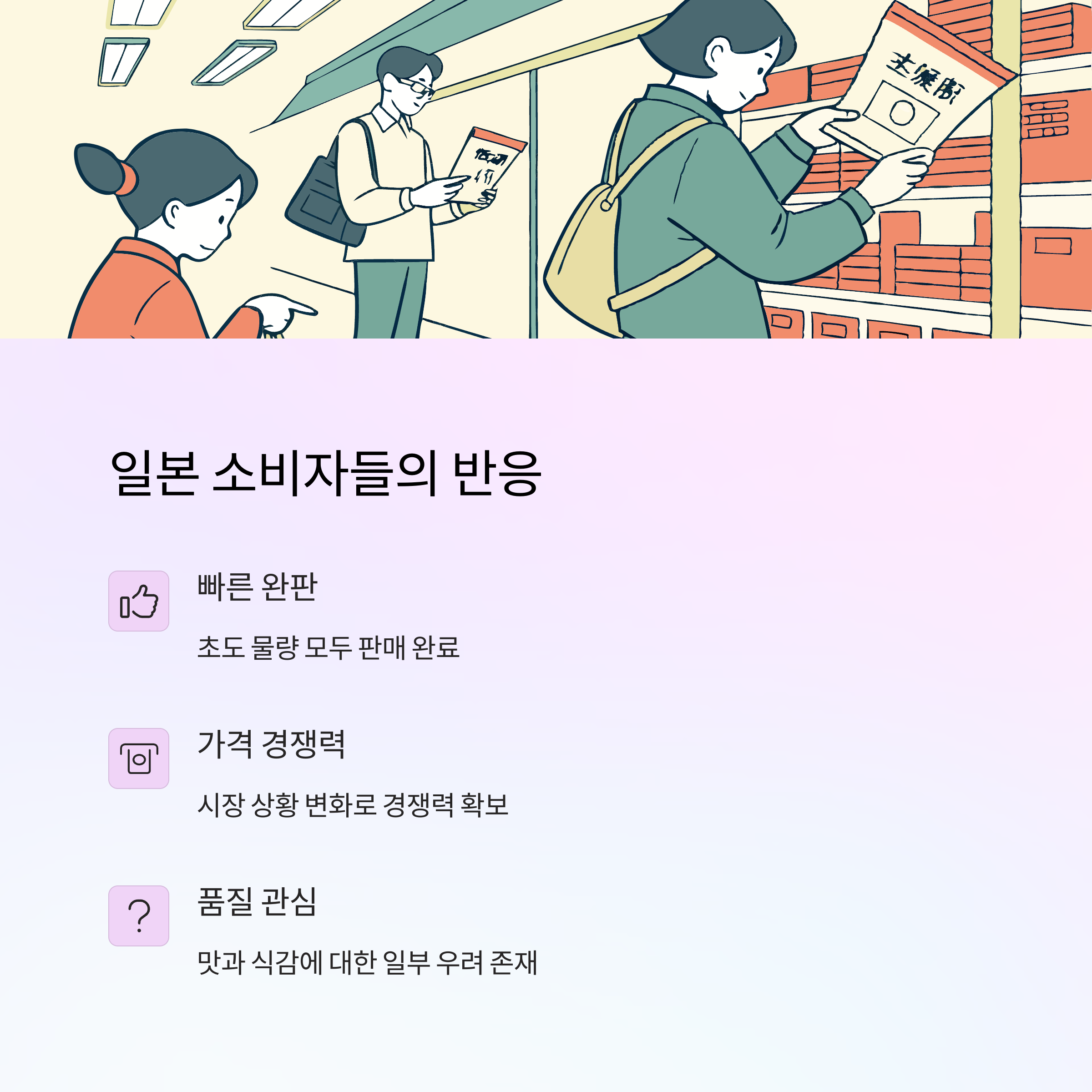 한국산 쌀은 일본에서 맛과 식감 부문에서의 평가가 엇갈리고 있다. 일부 소비자는 낮은 가격을 이유로 소비를 결정하지만, 일본산 쌀과의 동일한 품질의 식감을 기대하는 소비자층은 신중한 반응을 보인다. 이는 시장 초기 단계에서 충분히 예상된 반응이며, 점차 마케팅 활동과 제품 품질 개선을 통해 긍정적인 이미지를 구축할 필요가 있다. 특히 일본 내 한국 시장과 연계한 적극적 홍보 및 시식 캠페인을 활용하면 장기적으로 소비자 신뢰를 쌓을 수 있다.