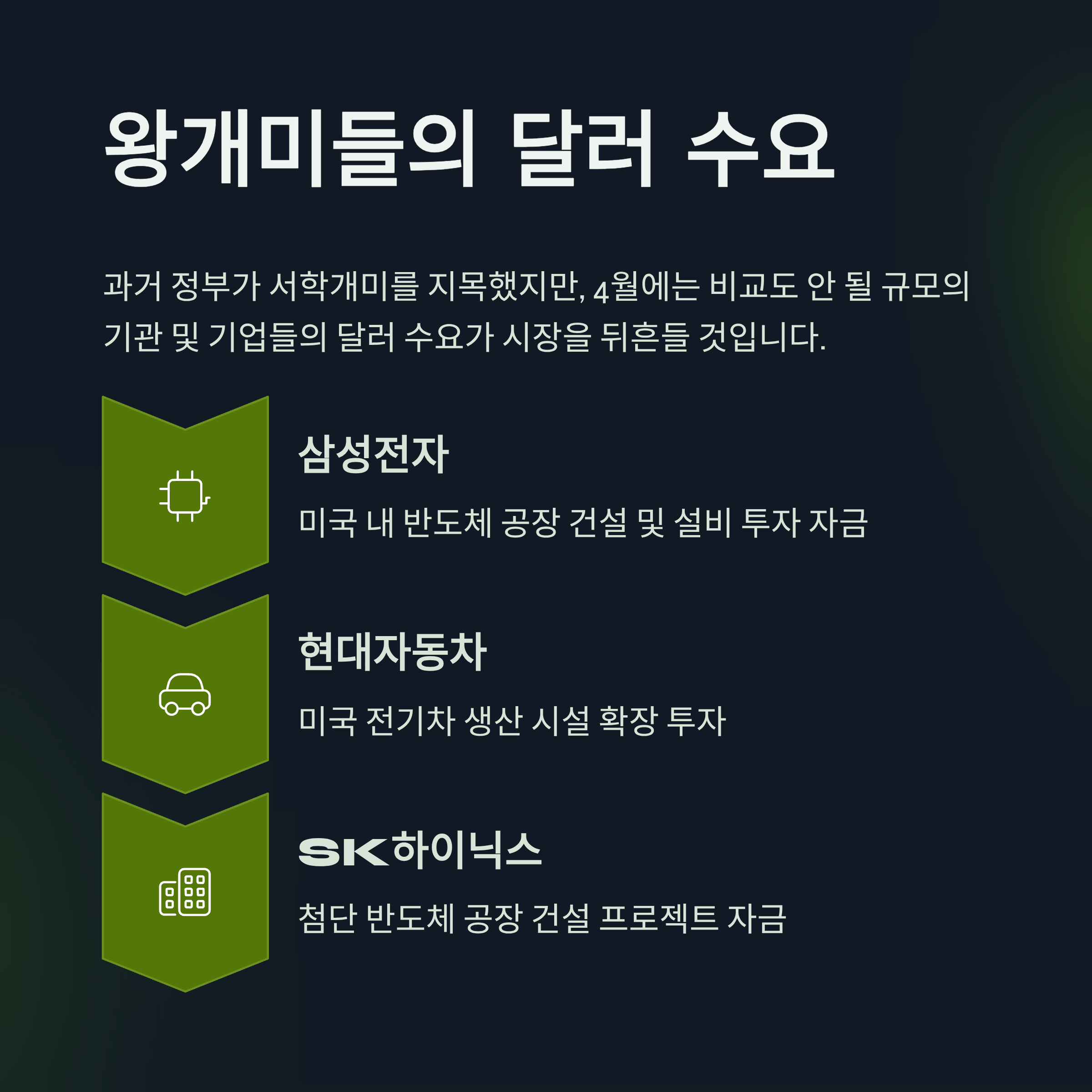 이러한 계절적 요인에 더해 구조적인 달러 수요도 폭증하고 있습니다. 정부 차원의 연간 200억 달러에 달하는 대미 투자 계획이 4월을 기점으로 가시화될 수 있으며, 이는 막대한 달러 유출로 이어집니다. 삼성, 현대차, SK하이닉스 등 국내 대기업들 역시 미국 내 공장 건설 및 설비 투자를 위한 자금 집행을 앞두고 있어 달러 수요를 부채질하고 있습니다. 과거 정부가 서학 개미들의 해외 투자를 환율 상승의 원인으로 지목했지만, 4월에는 비교도 안 될 규모의 '왕개미(기관 및 기업)'들의 달러 수요가 시장을 뒤흔들 수밖에 없는 구조입니다.