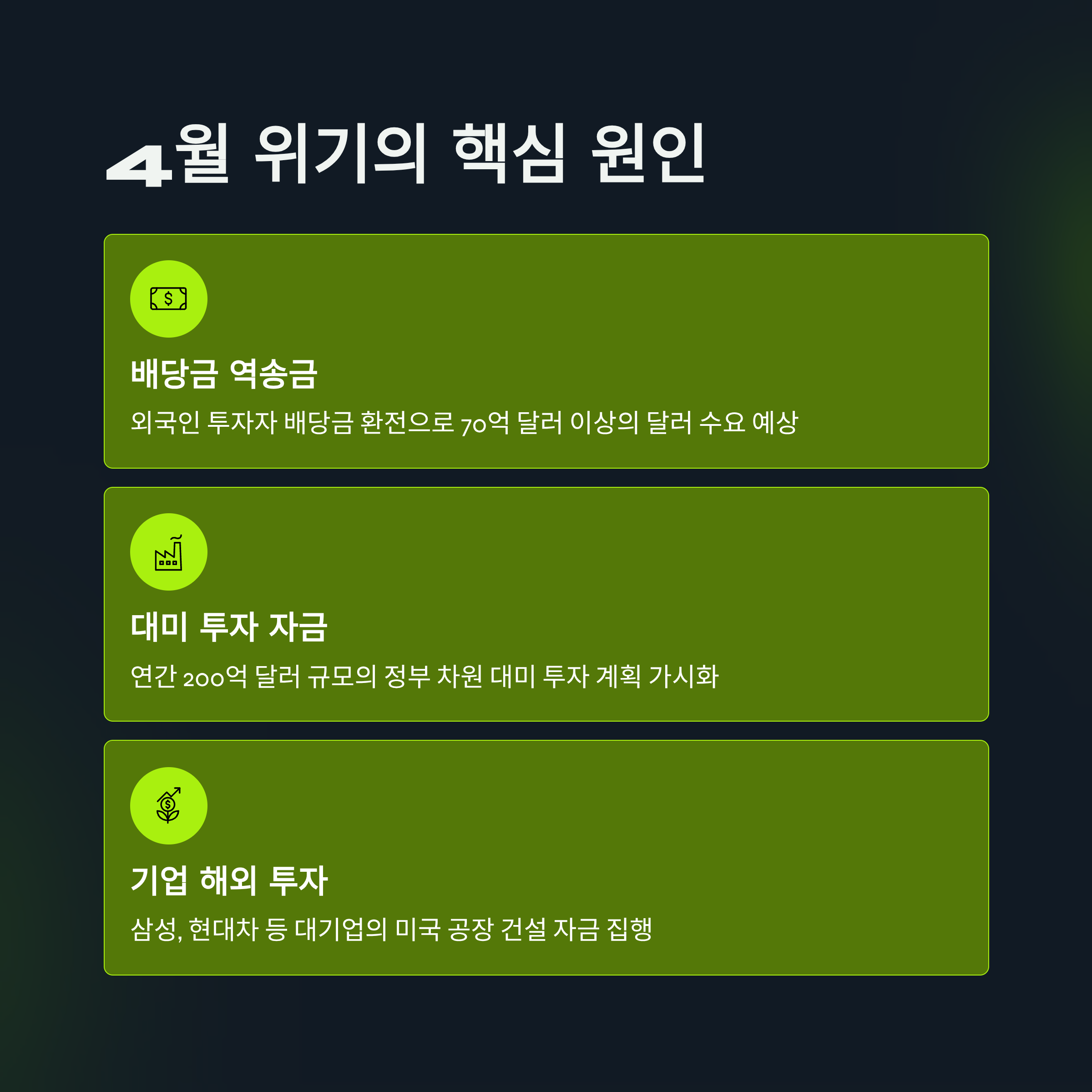 외국인 배당금 역송금으로 약 70억 달러 이상의 달러 환전 수요가 예상되며, 대미 투자 자금 및 국내 기업의 해외 투자 등 대규모 달러 수요가 4월에 집중됩니다. 이러한 구조적인 달러 수요 증가는 원-달러 환율 급등의 직접적인 압박 요인입니다.