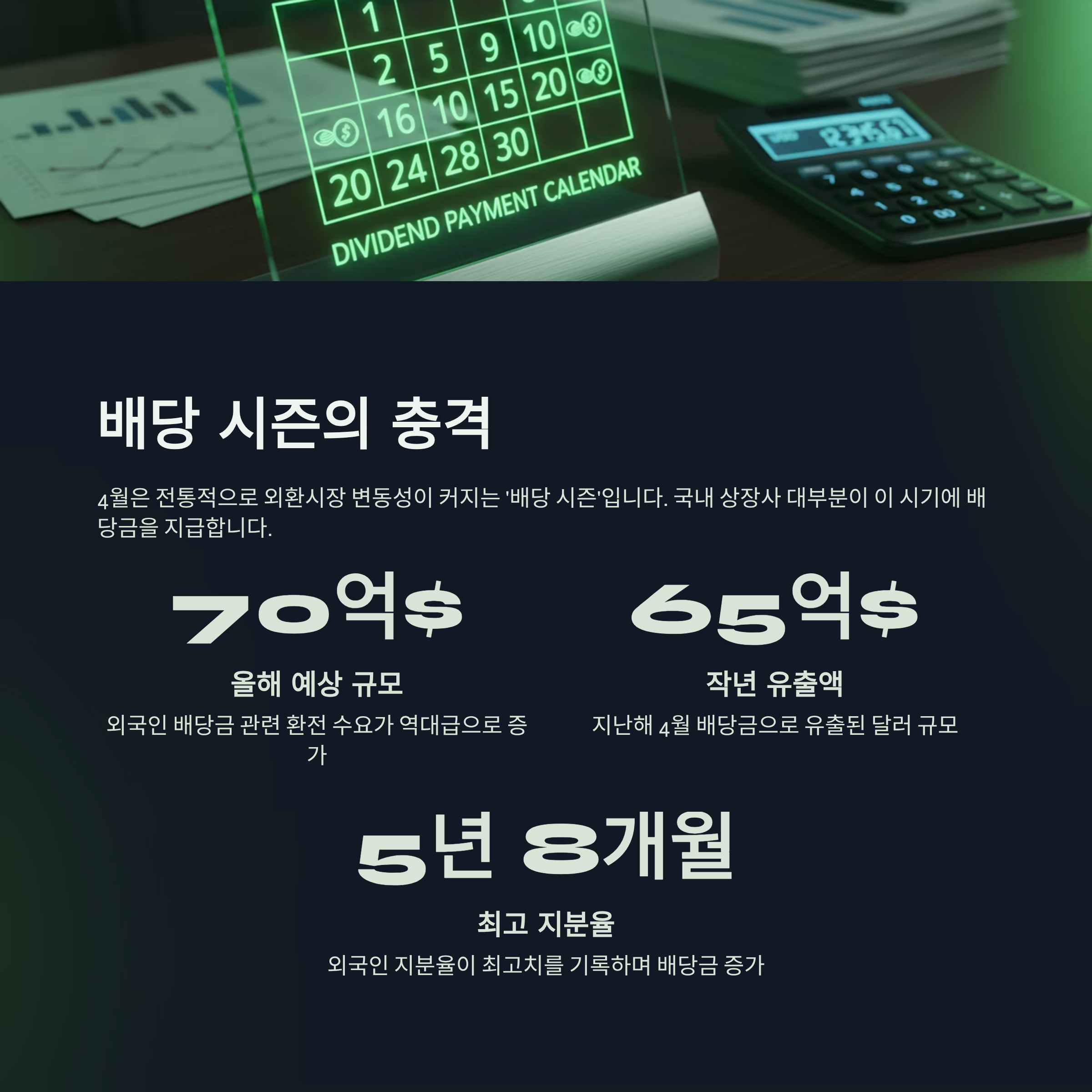 | A1. 4월은 국내 기업들의 배당금 지급이 집중되는 시기입니다. 외국인 투자자들은 이때 받은 원화 배당금을 달러로 환전해 본국으로 보내는데, 이 규모가 수십억 달러에 달해 일시적으로 달러 수요가 폭증하기 때문입니다. 여기에 기업들의 해외 투자 자금 집행까지 겹치면서 환율 상승 압력이 극대화될 수 있습니다. |