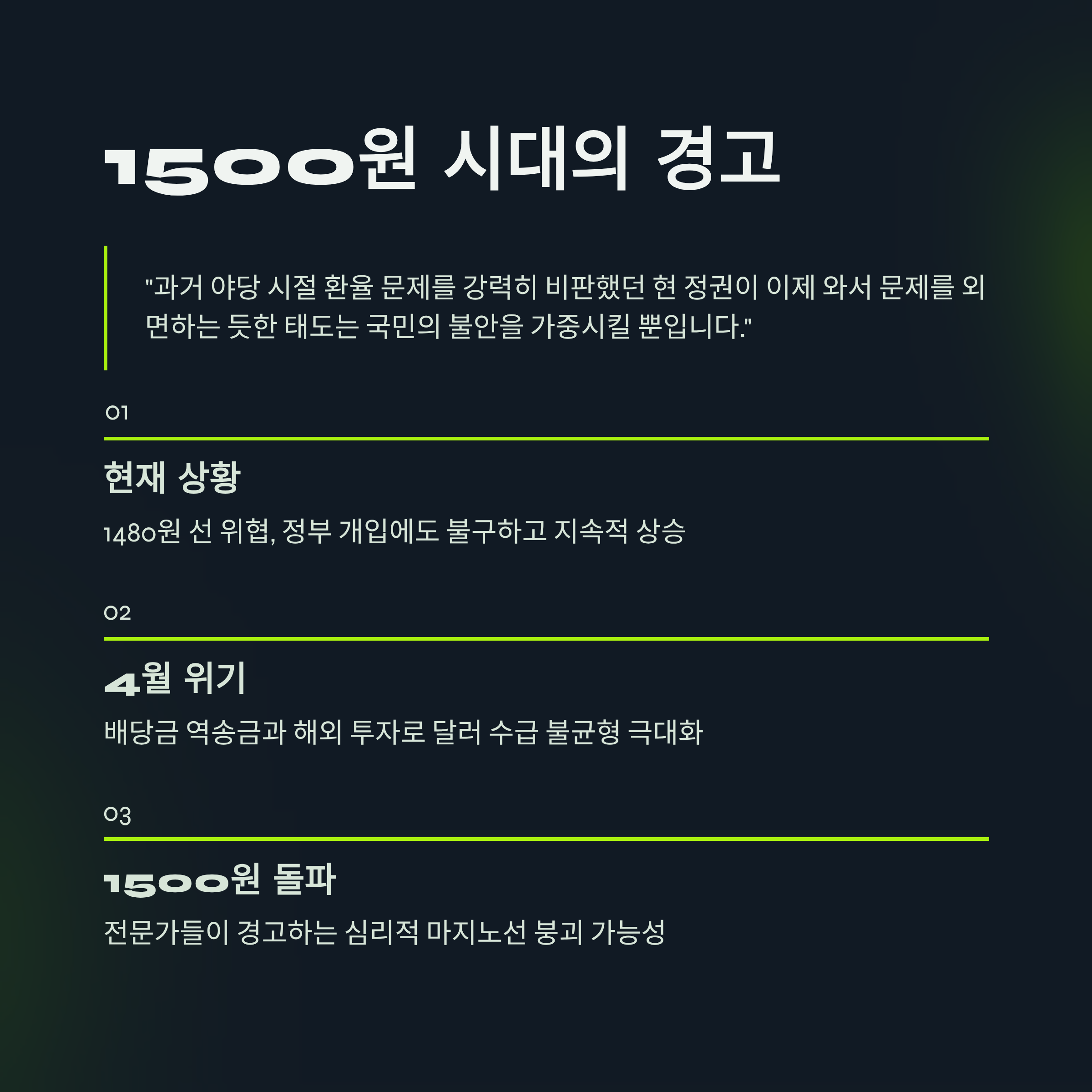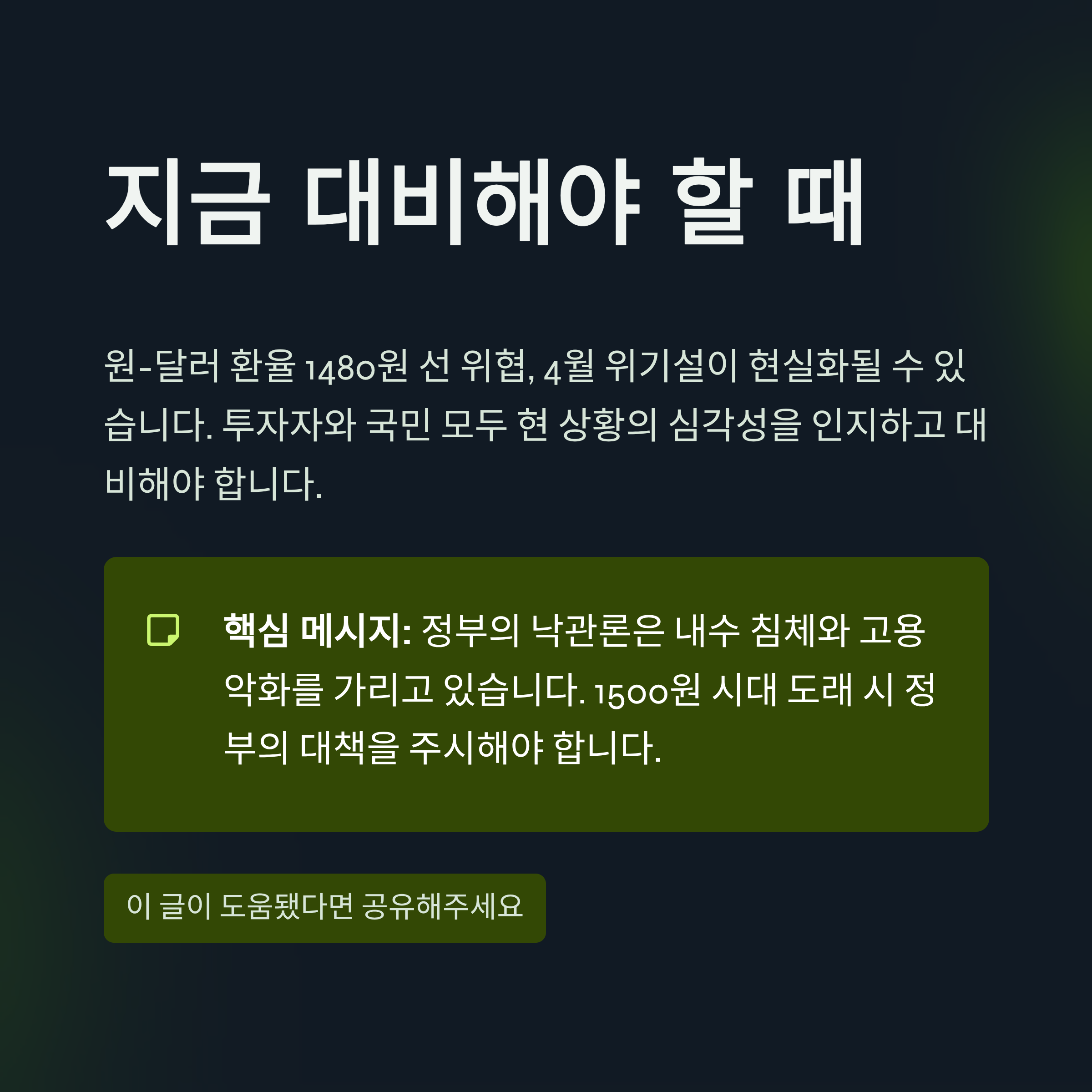 현재 원-달러 환율은 1480원 선을 위협하며 불안한 흐름을 이어가고 있습니다. 특히 외국인 배당금 역송금과 대규모 해외 투자가 집중될 4월에는 달러 수급 불균형이 극에 달하며 '4월 위기설'이 현실화될 수 있다는 우려가 큽니다. 반도체 수출 호조를 내세운 정부의 낙관론은 내수 침체와 고용 악화라는 이면을 가리고 있어 설득력을 잃고 있습니다. 과거 야당 시절 환율 문제를 강력히 비판했던 현 정권이 이제 와서 문제를 외면하는 듯한 태도는 국민의 불안을 가중시킬 뿐입니다. 전문가들이 경고하는 1,500원 시대가 도래했을 때, 정부가 어떤 대책을 내놓을지 지켜봐야 할 것입니다. 투자자와 국민 모두 현 상황의 심각성을 인지하고 대비해야 할 시점입니다.