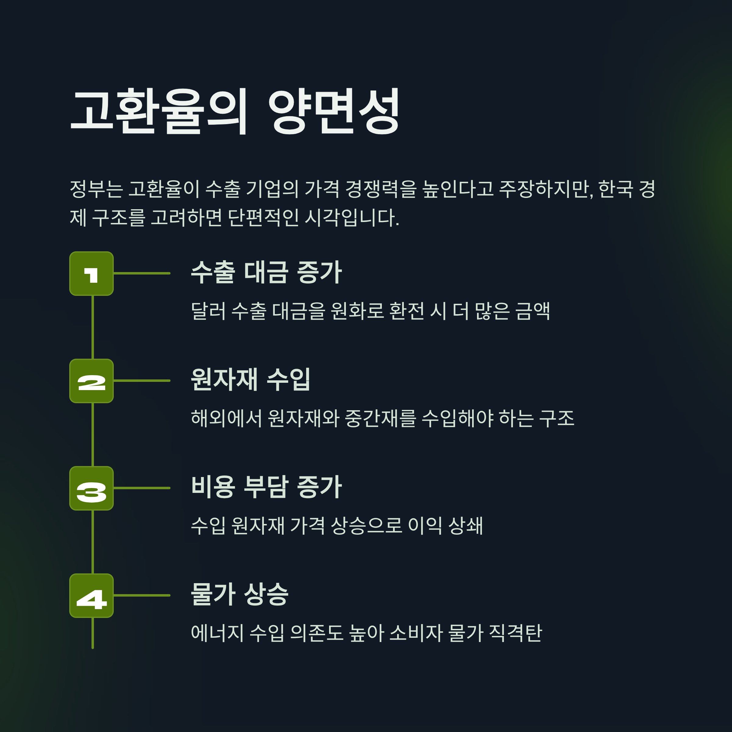 결과적으로 고환율은 수출 대금의 가치를 높여주지만, 동시에 수입 원자재 가격 부담을 가중시키는 이중적인 효과를 낳습니다. 환율 상승으로 얻은 이익이 원자재 가격 상승으로 상당 부분 상쇄되는 것입니다. 특히 원유, 가스 등 에너지 수입 의존도가 절대적인 우리나라의 경우, 고환율은 기업의 생산 비용 증가와 소비자 물가 상승으로 직결될 수밖에 없습니다. 따라서 '고환율=수출 호조'라는 공식은 더 이상 통용되기 어려운, 현실을 왜곡하는 주장일 수 있습니다.