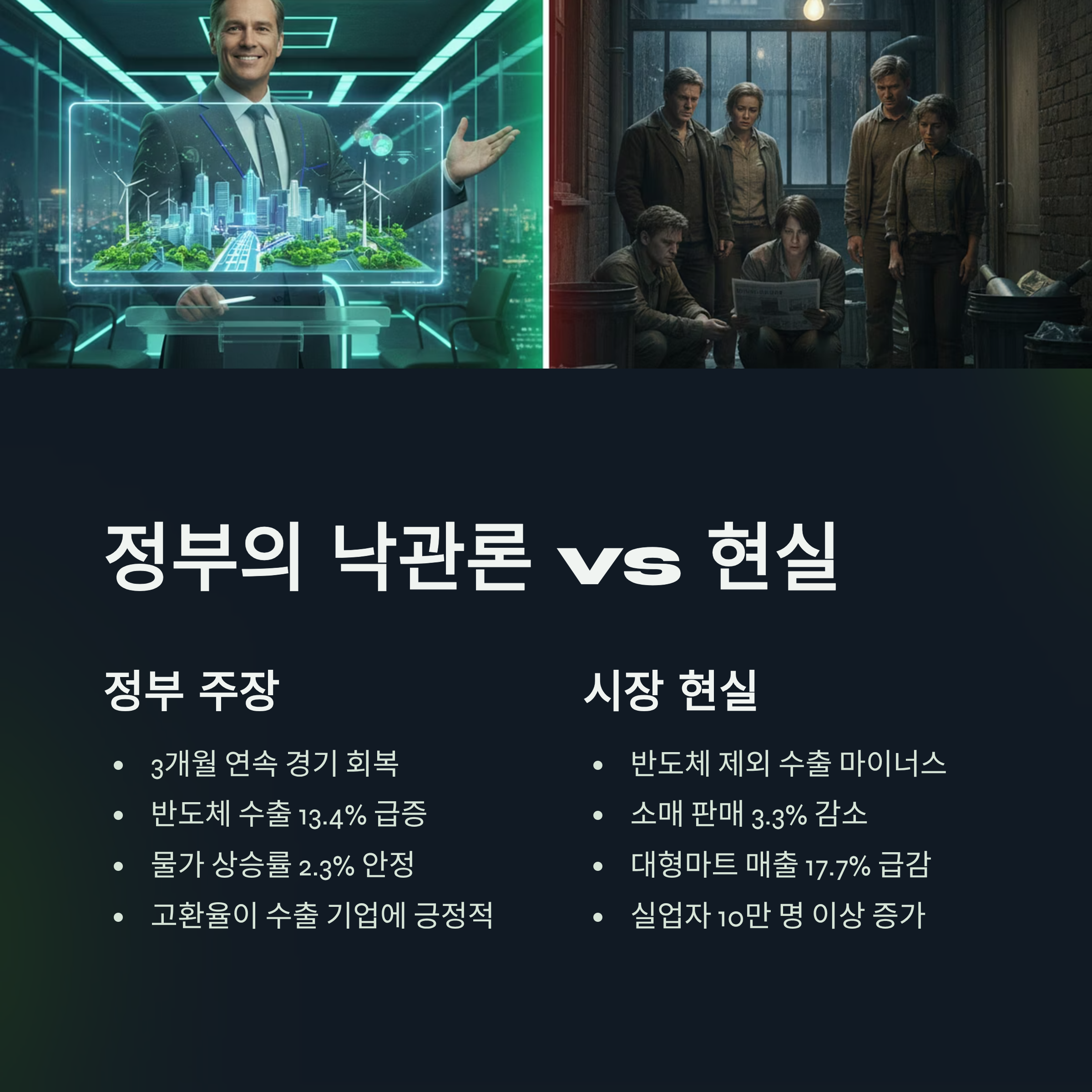 수출 호조는 반도체 착시 효과일 뿐, 실제로는 내수 침체와 고용 둔화 등 불안 요인이 상존하여 정부의 낙관론과는 큰 차이를 보이고 있습니다.