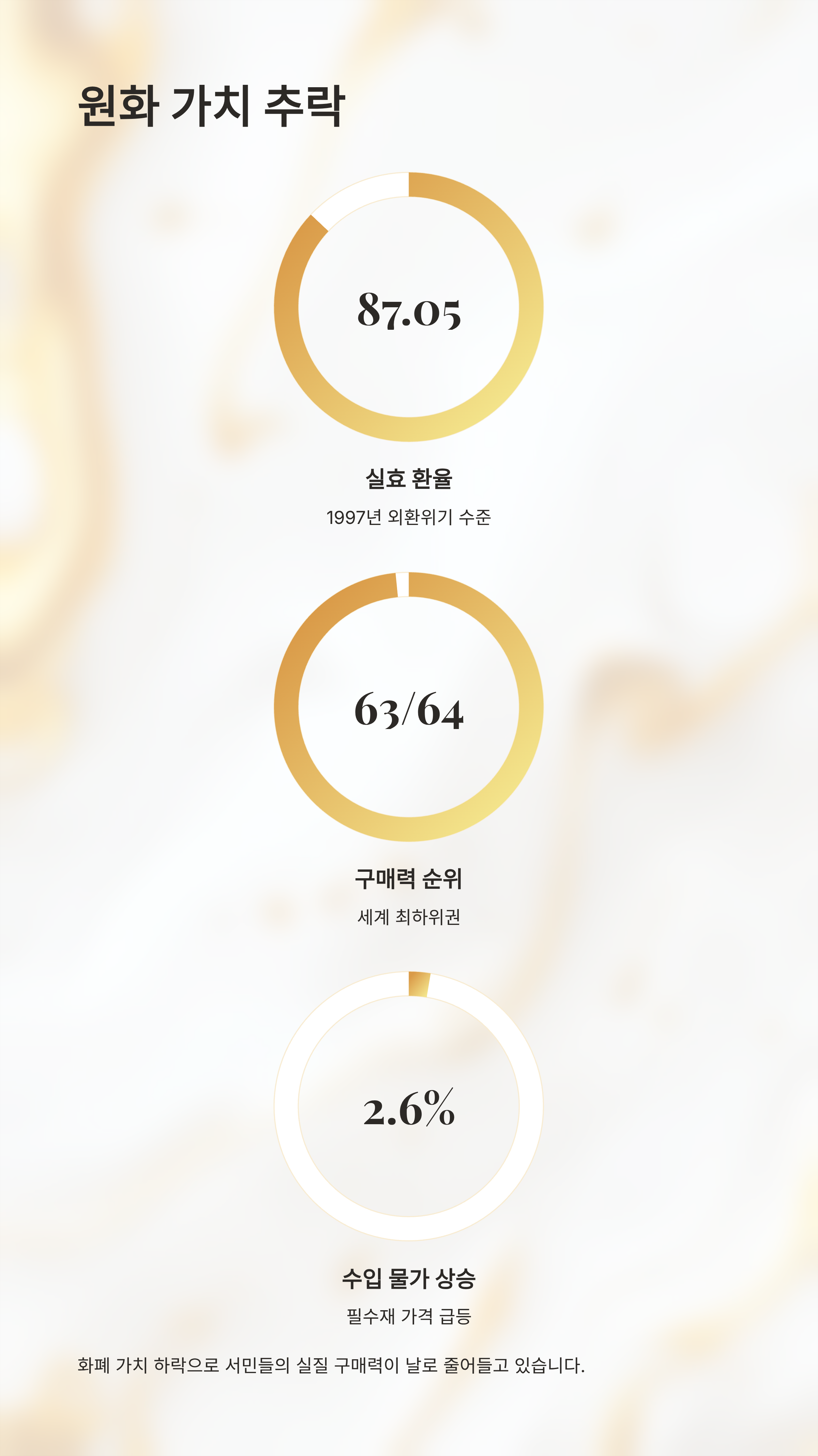 원화의 실효 환율은 87.05로 내려앉아 1997년 외환위기 당시와 유사한 수준에 달했습니다. 이는 세계 64개국 중 63위라는 충격적인 구매력 순위로 나타났습니다. 화폐 가치가 하락하며 수입 물가는 급등해 소비자와 생산자 물가 모두 상승 압박을 받고 있는 상황입니다. 이로 인해 서민들의 실질 구매력은 날로 줄어들고 있습니다.