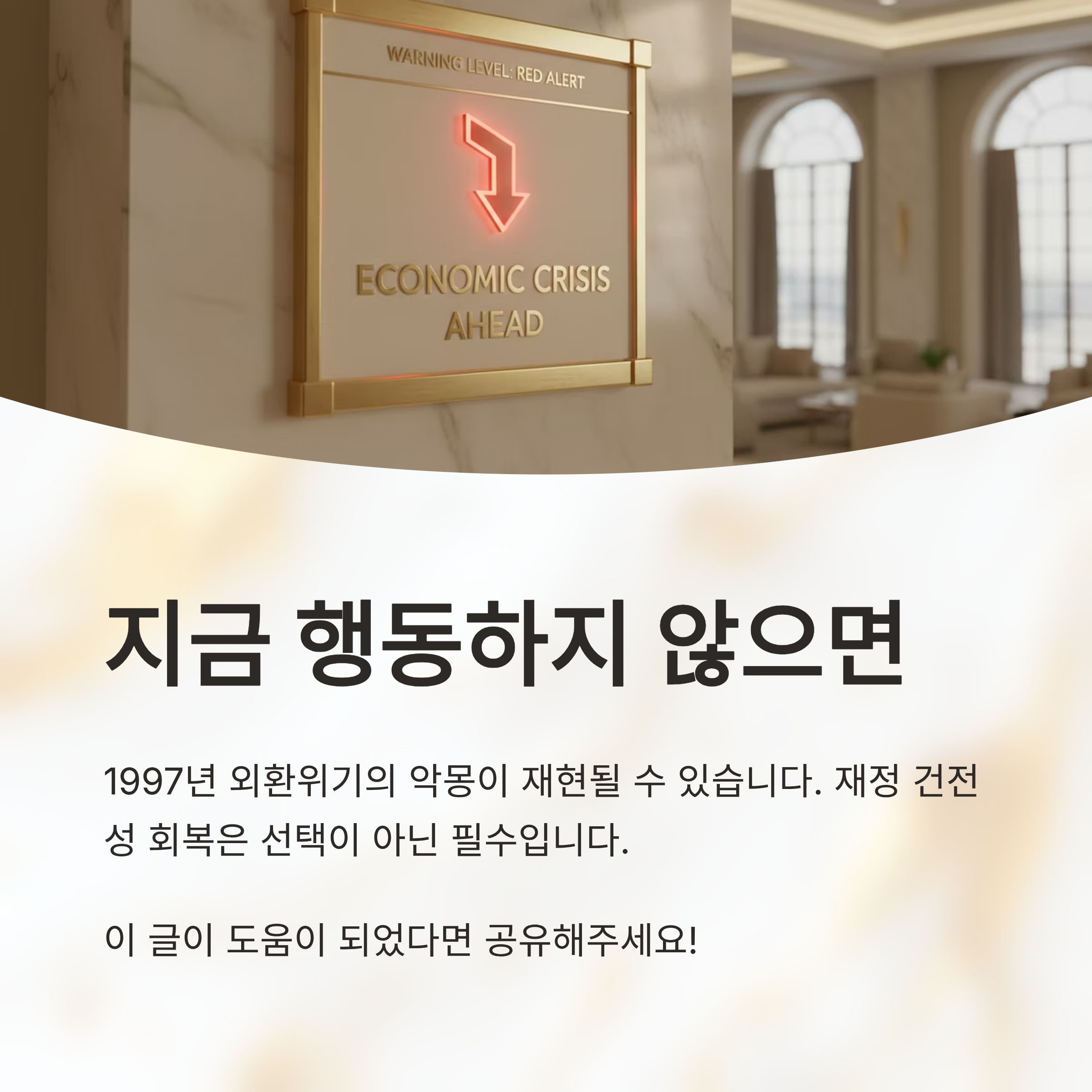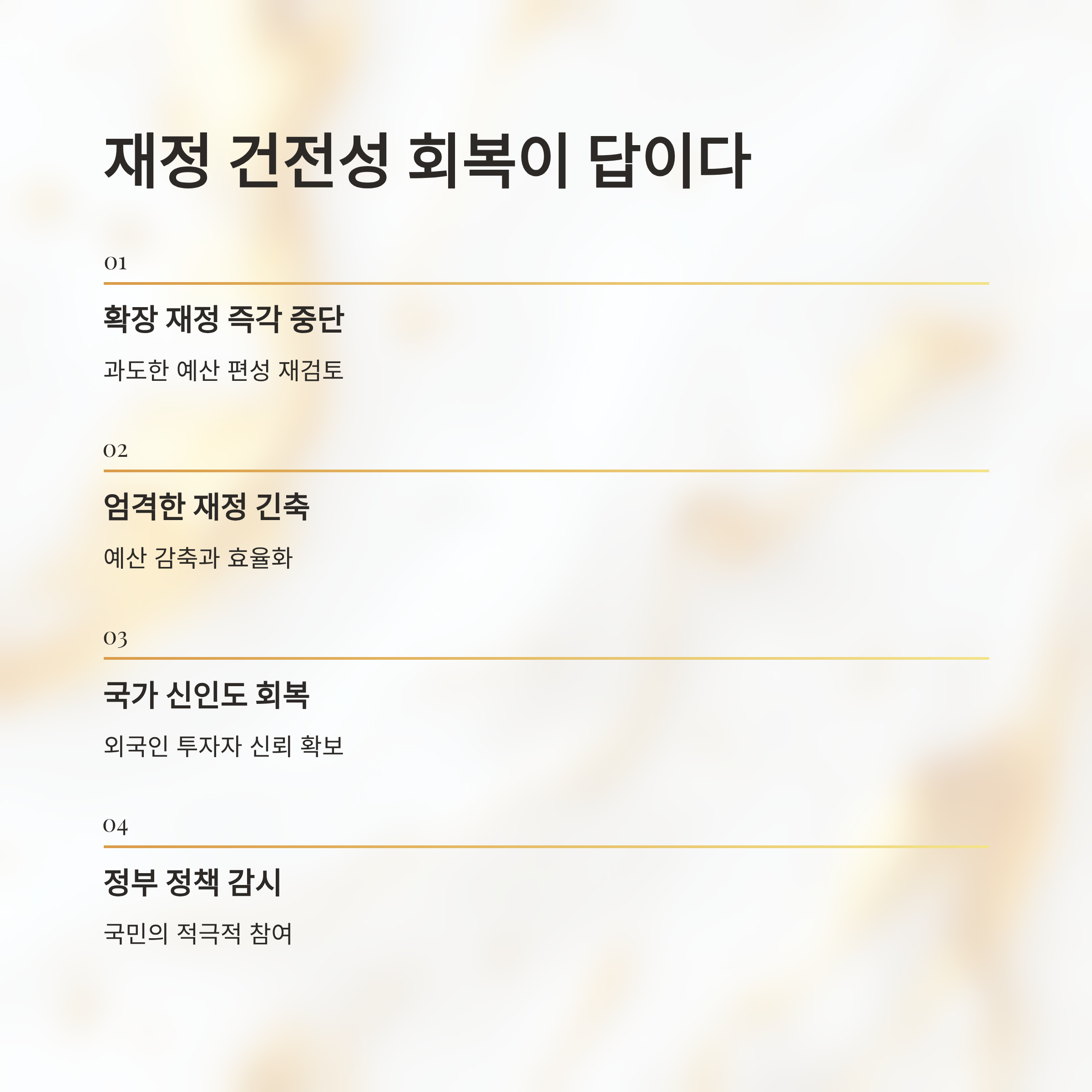 IMF가 보낸 경고는 명백히 대한민국 경제가 파국 위기에 접어들었음을 드러냅니다. 정부는 과도한 확장 재정을 즉각 중단하고 엄격한 재정 긴축 정책으로 돌아서야 합니다. 국가 신인도 회복을 위한 예산 감축과 효율화가 요구됩니다. 더불어 국민들도 경제 정책이 불러올 장기적인 결과를 인지하고, 정부 정책을 감시해야 합니다. 재정 건전성을 회복하지 못할 경우, 1997년 외환위기의 악몽이 재현될 수 있습니다.
