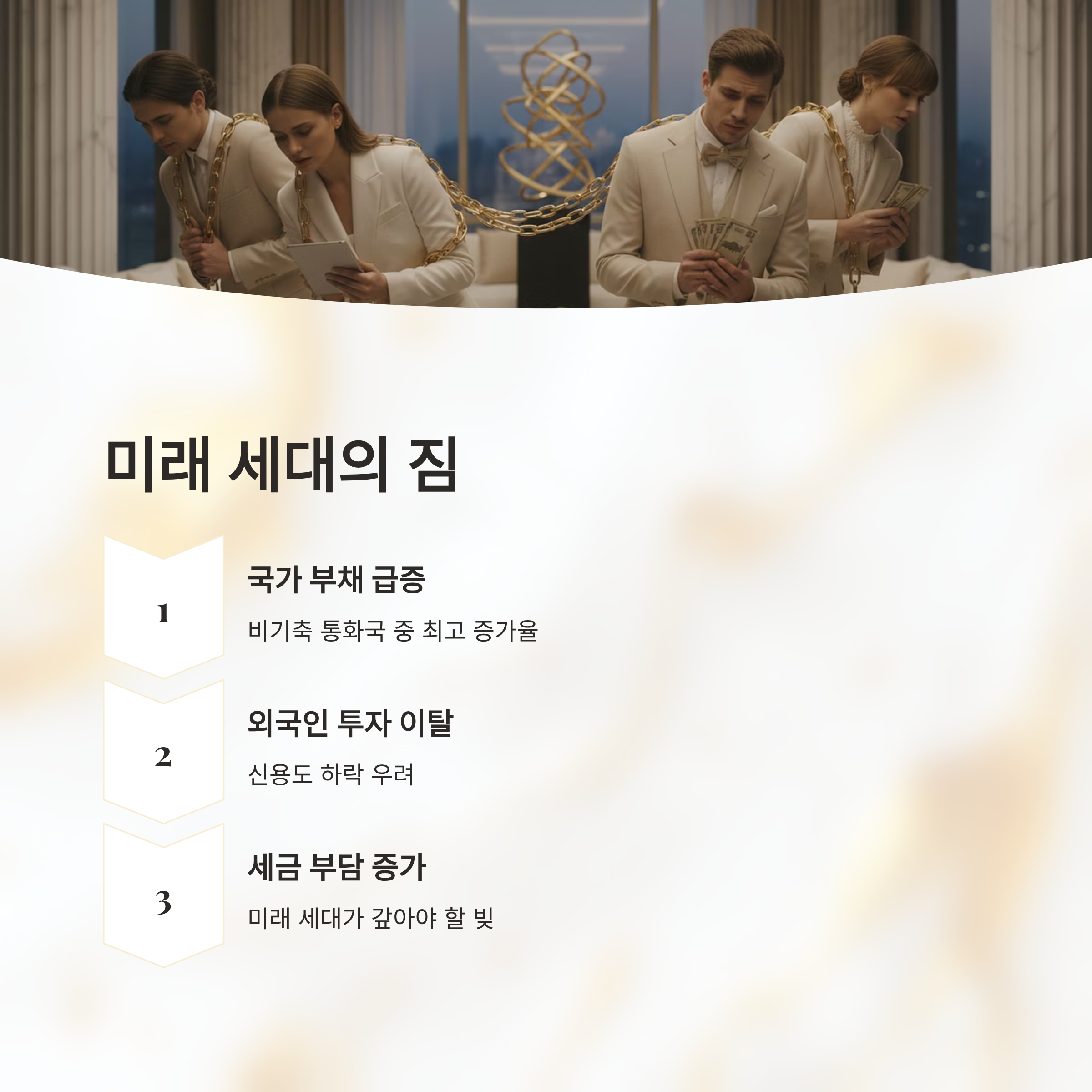 한국은 기축 통화국이 아니므로, 대규모 국가 부채 증가는 외국인 투자자 신뢰 하락으로 직결될 수밖에 없습니다. 외국 자본 이탈과 신용 등급 강등의 악순환이 시작되면, 미래 세대는 결국 이 과도한 부채를 갚기 위해 세금 부담 증가와 성장 둔화를 동시에 감내해야 할 것입니다. 지금의 잘못된 선택이 미래 경제 기반을 붕괴시킬 수 있다는 점은 명확합니다.