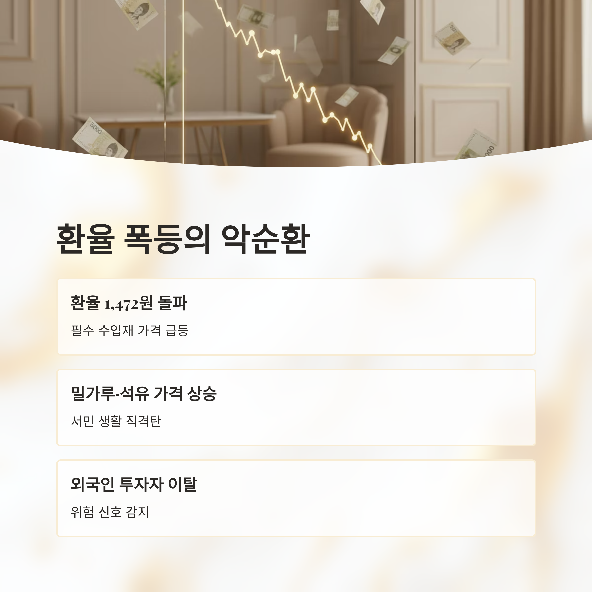환율이 1,472원을 넘어서면서 필수 수입재의 가격이 급격히 올랐습니다. 밀가루, 석유 등 필수 품목의 가격이 올라 서민 생활을 더 어렵게 만들고, 이는 정부 경제 정책 실효성을 더욱 약화시키는 결과를 초래하고 있습니다. 더 나아가 화폐 가치 하락의 신호는 외국인 투자자들에게 위험 신호로 작용하고 있습니다.