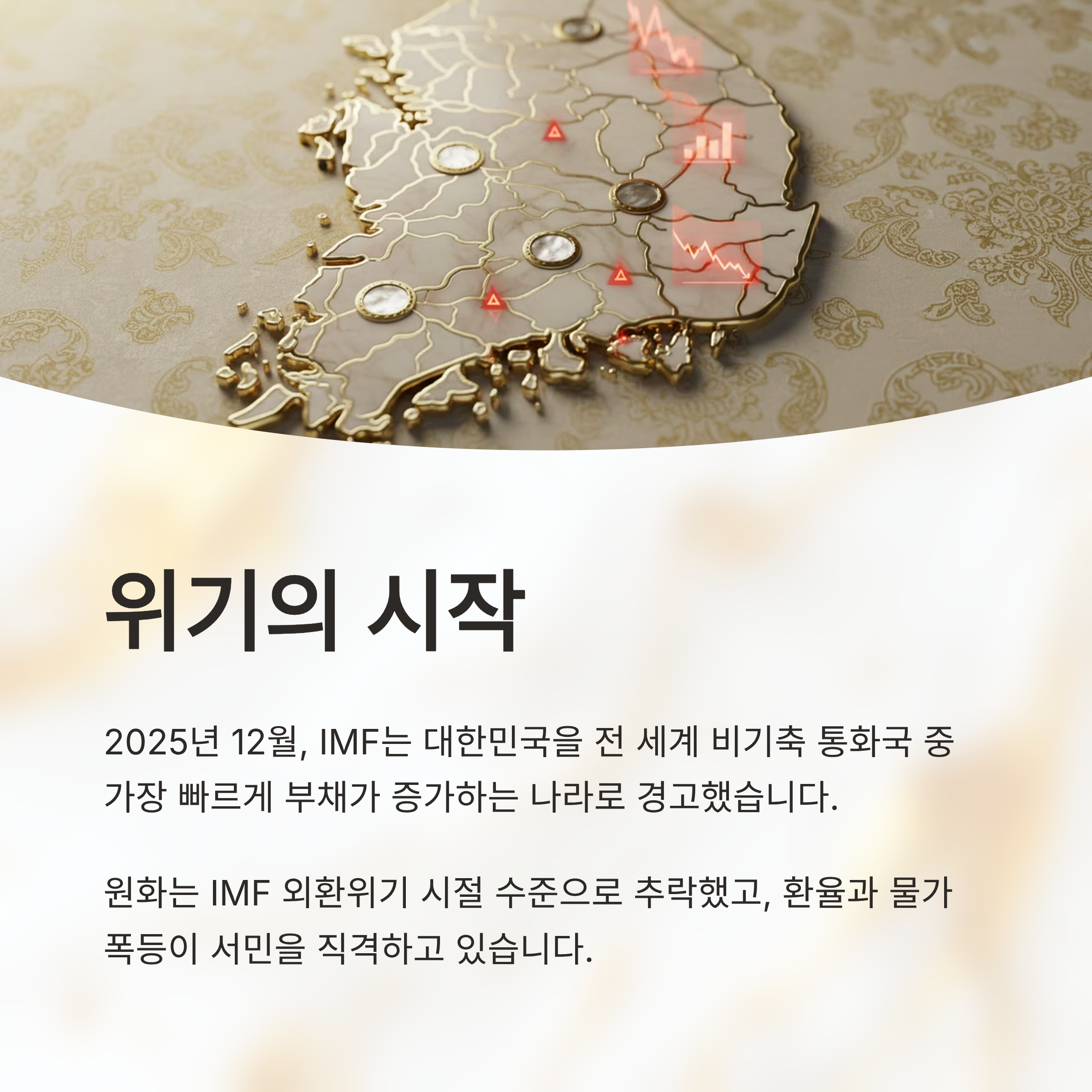 2025년 12월, 대한민국 경제에 붉은 경고 신호가 켜졌습니다. IMF는 대한민국을 전 세계 비기축 통화국 중 가장 빠르게 부채가 증가하는 나라로 경고하며, 이재명 정권 경제의 위기적 상태를 강조했습니다. 한국은 마치 기축 통화국처럼 빚을 남발하며 확장 재정을 추진하고 있는데, 이는 경제 전문가들이 "경제적 자살 행위"라고 까지 비판할 정도입니다.
