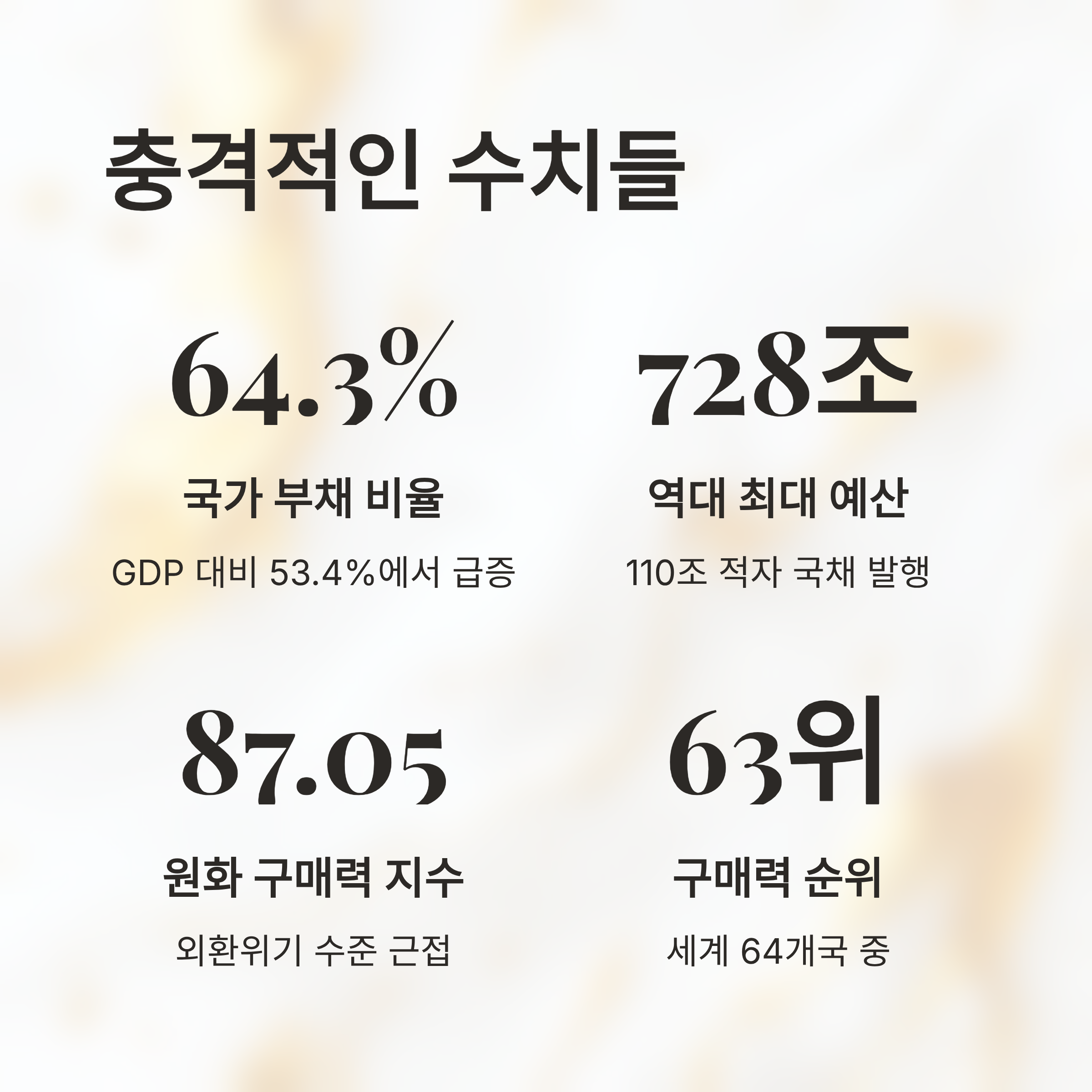 - 핵심요약: 국가 부채 급증과 원화 가치 추락의 주요 지표 정리