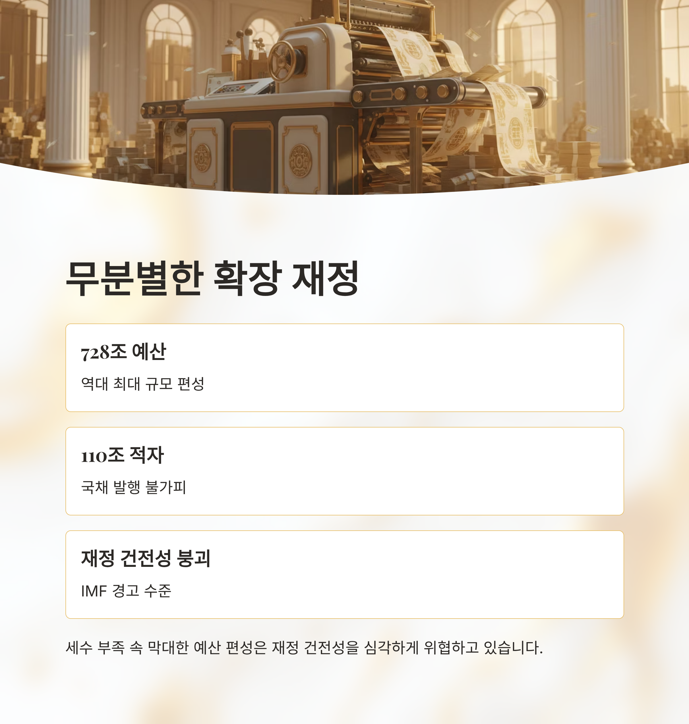 이재명 정부는 확장 재정을 강행하며 역대 최대인 728조 원의 예산안을 제출했습니다. 하지만 세수 부족에 직면한 상황에서 110조 원의 적자 국채를 발행해야 하는 이 방식은 재정 건전성을 흔드는 절박한 결과를 초래했습니다. IMF는 이러한 부채의 급격한 증가 속도가 비기축 통화국 중 가장 빠르다고 경고했으며, 이는 단순한 경고를 넘어 향후 국가 신용도 하락과 금융 위기의 불씨가 될 수 있습니다.