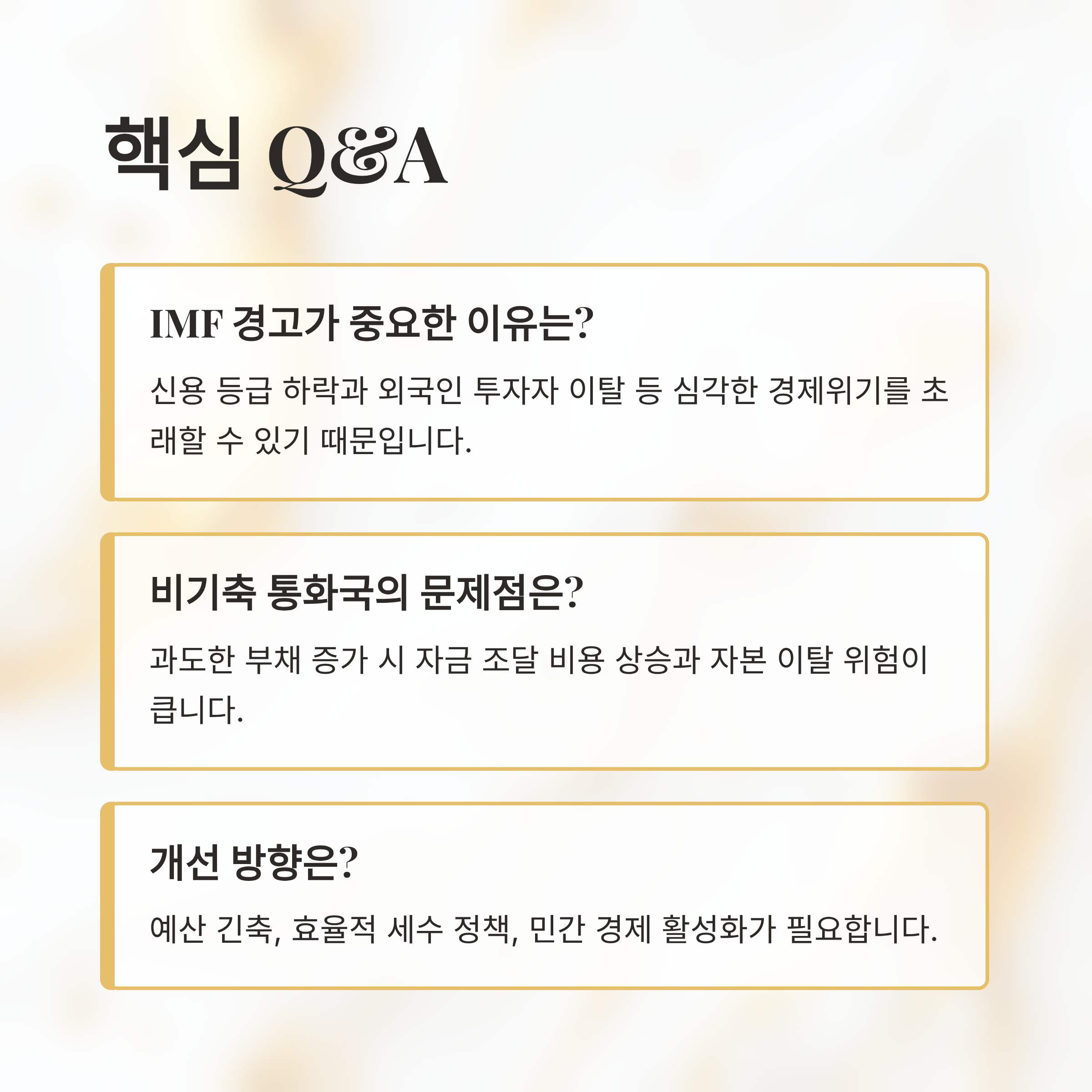 | A. IMF 경고는 국가 경제의 신뢰도를 평가하며, 부채와 재정 문제로 인해 신용 등급 하락 및 외국인 투자자 이탈 등 심각한 경제위기를 초래할 수 있기 때문에 매우 중요합니다. |