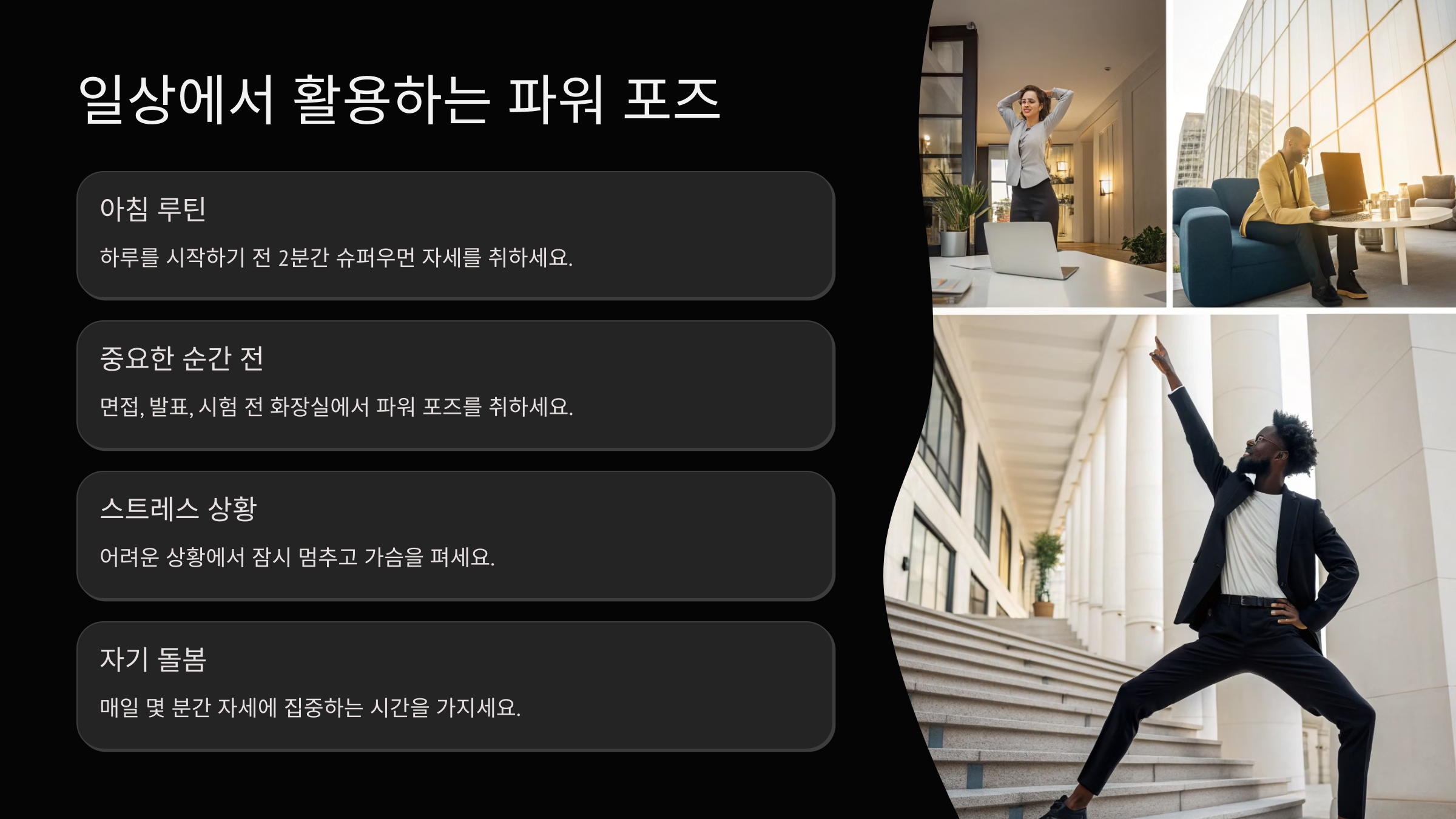 Cuddy가 강조하는 파워 포즈는 손을 허리에 얹고 가슴을 펴는 ‘원더우먼 자세’나, 팔을 위로 들어 올리는 승리의 포즈처럼 자신감 넘치는 모습입니다. 이 자세를 단 2분만 취해도 면접 전 불안한 마음을 진정시키고, 실제로 더 좋은 성과를 낼 수 있다는 실험 결과도 소개됩니다.