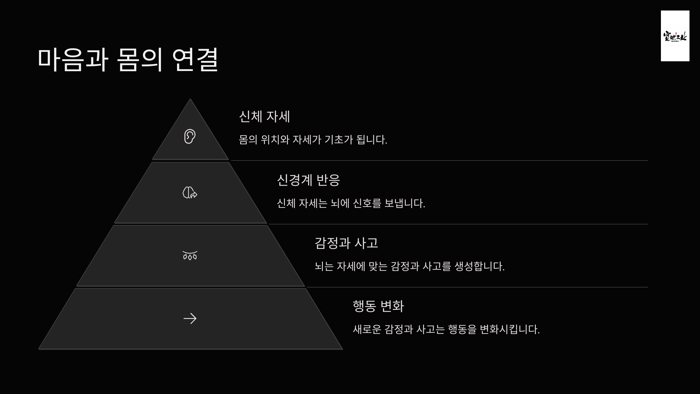 - 바디 랭귀지(body language)는 타인뿐만 아니라 자기 자신에게도 영향을 미친다.