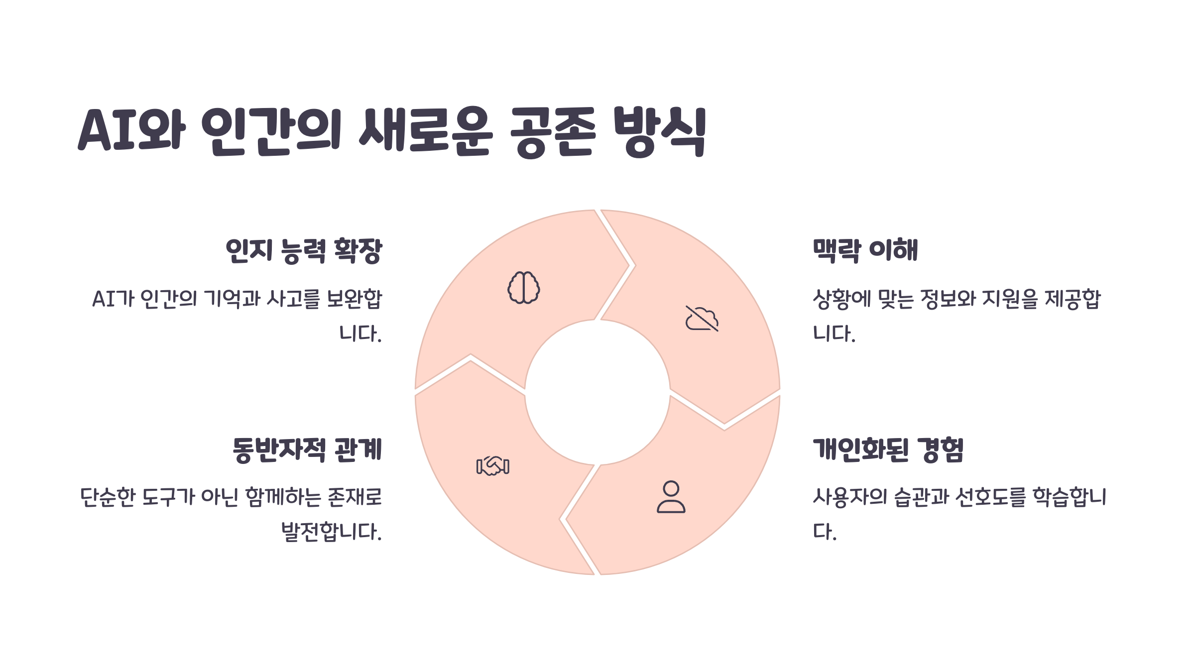 - 미래 비전: AI는 더 이상 도구가 아니라 “연결된 존재”, 인간의 인지와 판단을 보완하는 동반자