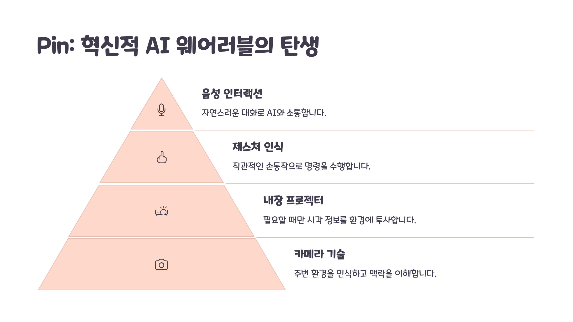 - 핵심 기술: 웨어러블 AI 장치 ‘Pin’, 음성과 제스처로 조작, 카메라와 프로젝터 내장