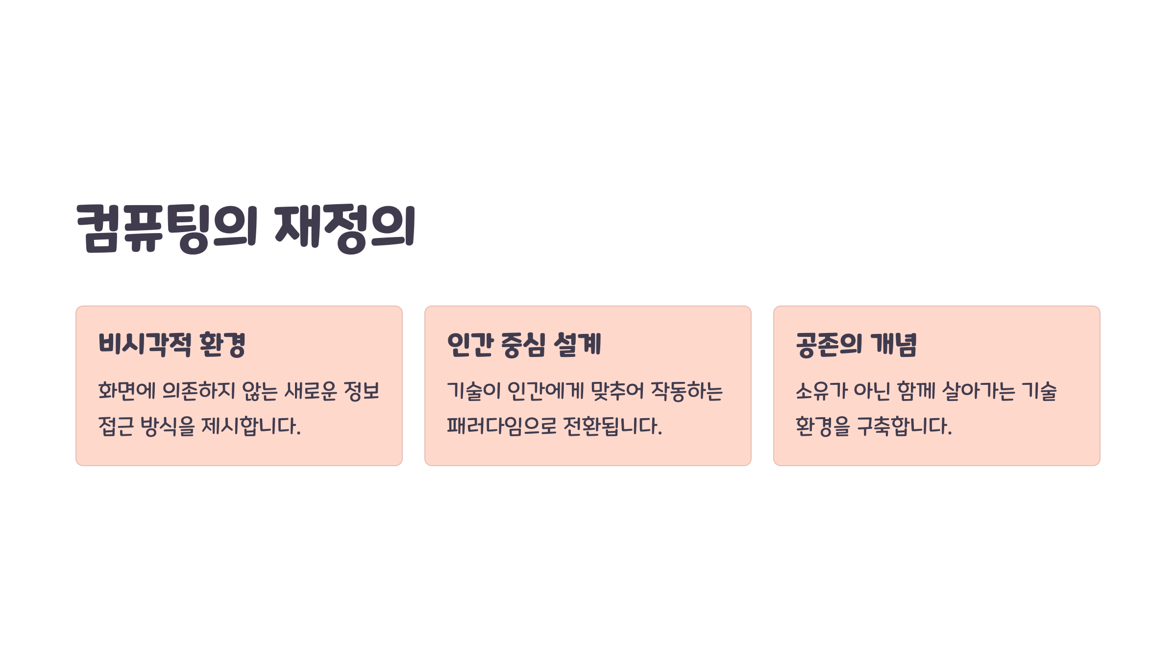 - 새로운 개념: ‘컴퓨팅을 재정의’ — 인간 중심, 비시각적, 비소유적 AI 환경