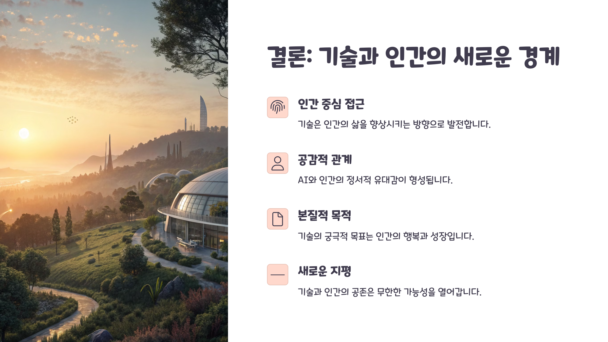 이는 윤리적 AI 개발, 개인정보 보호, 접근성 등 현대 기술이 풀어야 할 숙제와도 맞닿아 있으며, 진정한 휴먼-테크놀로지의 미래 비전으로 볼 수 있습니다.