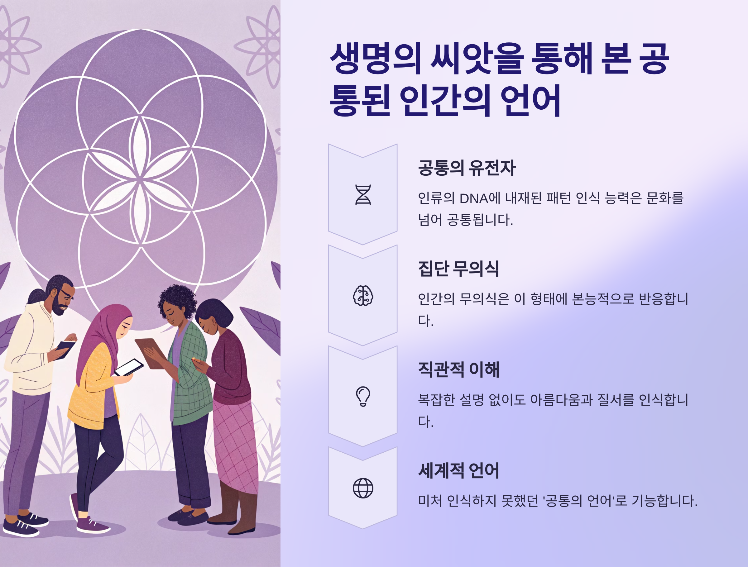 Seed of Life 문양은 육각형 패턴이 중심에 배치되고, 겹쳐진 원이 꽃처럼 배열된 구조로 구성되어 있습니다. 놀라운 점은 이 도형이 고대 이집트의 신전, 인도 사원, 유대교 카발라 문서, 르네상스 시대의 성화 등 다양한 문화권에서 반복적으로 등장한다는 사실입니다. Terry Moore는 이러한 반복이 단순한 우연이 아니라, 인간 내면의 공통된 감각 혹은 우주의 구조에 대한 본능적 이해일 수 있다고 말합니다. 이는 칼 융이 제안한 ‘집단 무의식’ 개념과도 닿아 있으며, 인간이 디자인을 통해 무엇인가를 공유하려는 본능을 드러냅니다.