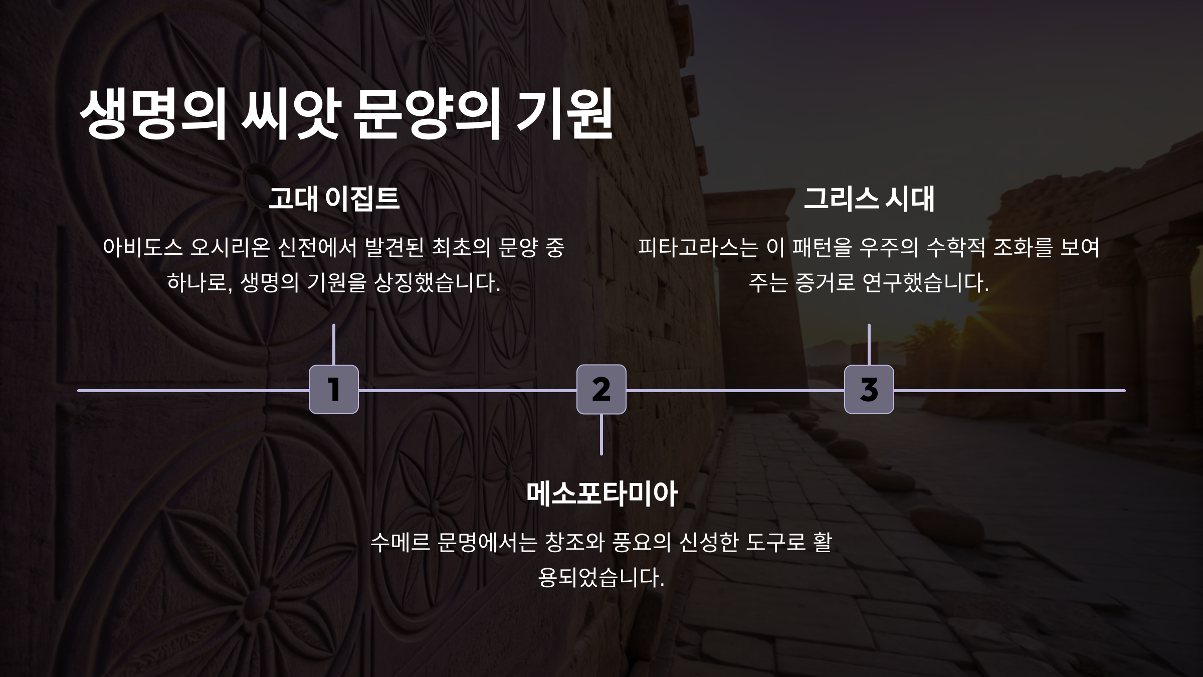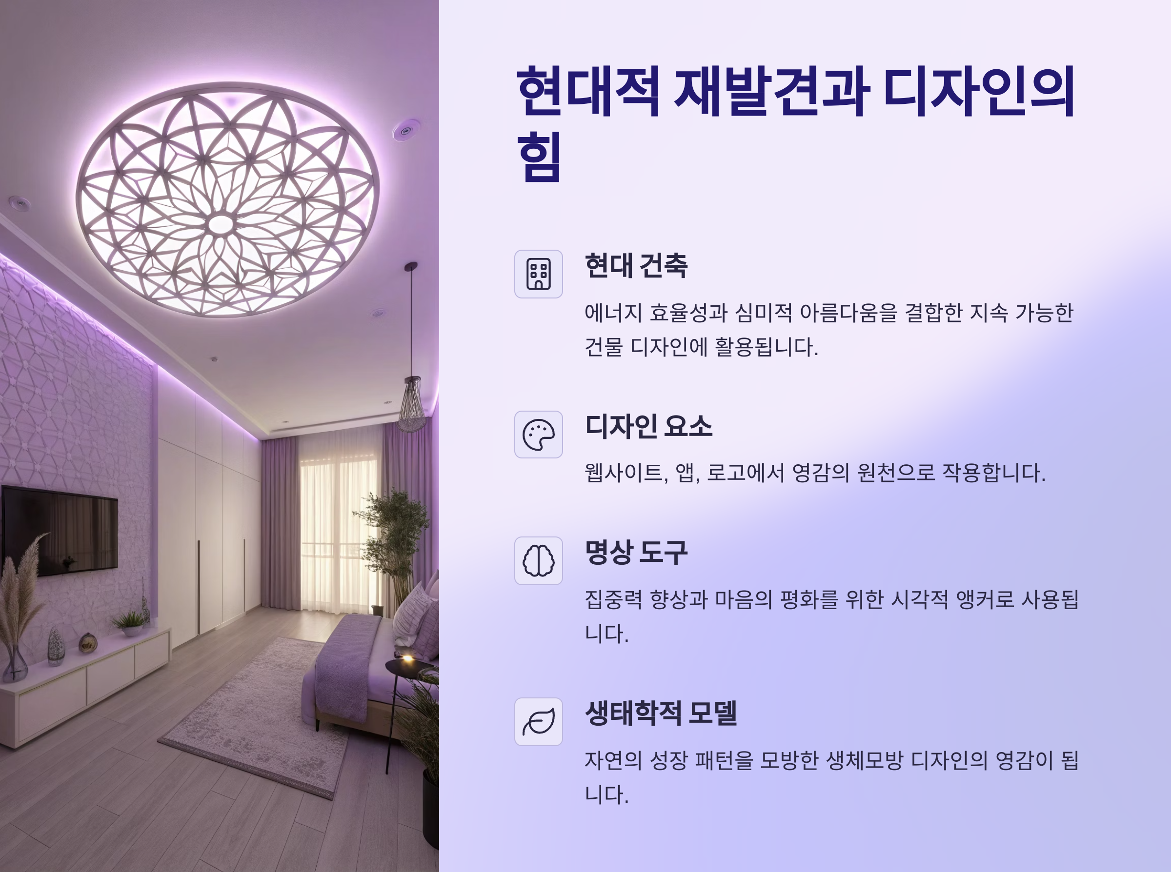 심리학자들은 인간이 균형과 반복된 패턴에 본능적으로 끌리는 경향이 있다고 말합니다. 또한 이 문양은 창조, 탄생, 연결 같은 보편적 개념과 맞닿아 있어, 시대를 초월해 사람들에게 울림을 줍니다.