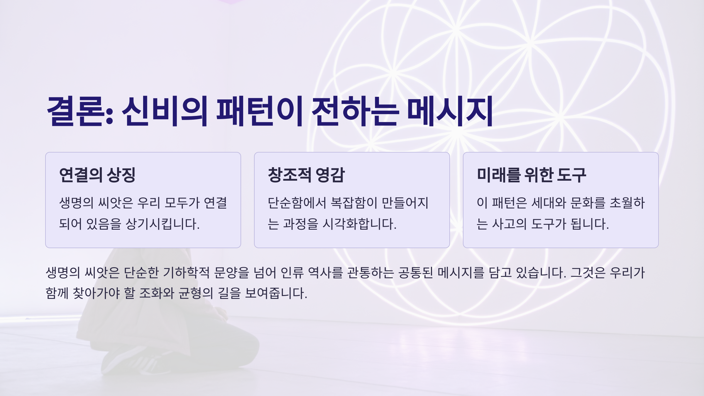 Seed of Life는 과거의 유물이나 종교의 상징을 넘어서, 인간이 어떻게 세상을 인식하고 표현해왔는지에 대한 시각적 기록입니다. 디자인은 시대를 초월한 메시지를 품고 있으며, 그것은 수천 년 후의 우리에게도 여전히 말을 겁니다. 이 강연은 작은 패턴 하나를 통해 우리 내면에 새겨진 본능, 연결, 그리고 이해를 되새기게 합니다. 디자인은 말 없는 언어이자, 인류가 함께 써 내려온 무언의 기록이었습니다. 그리고 그 기록은 오늘도 우리를 바라보며 말을 겁니다.