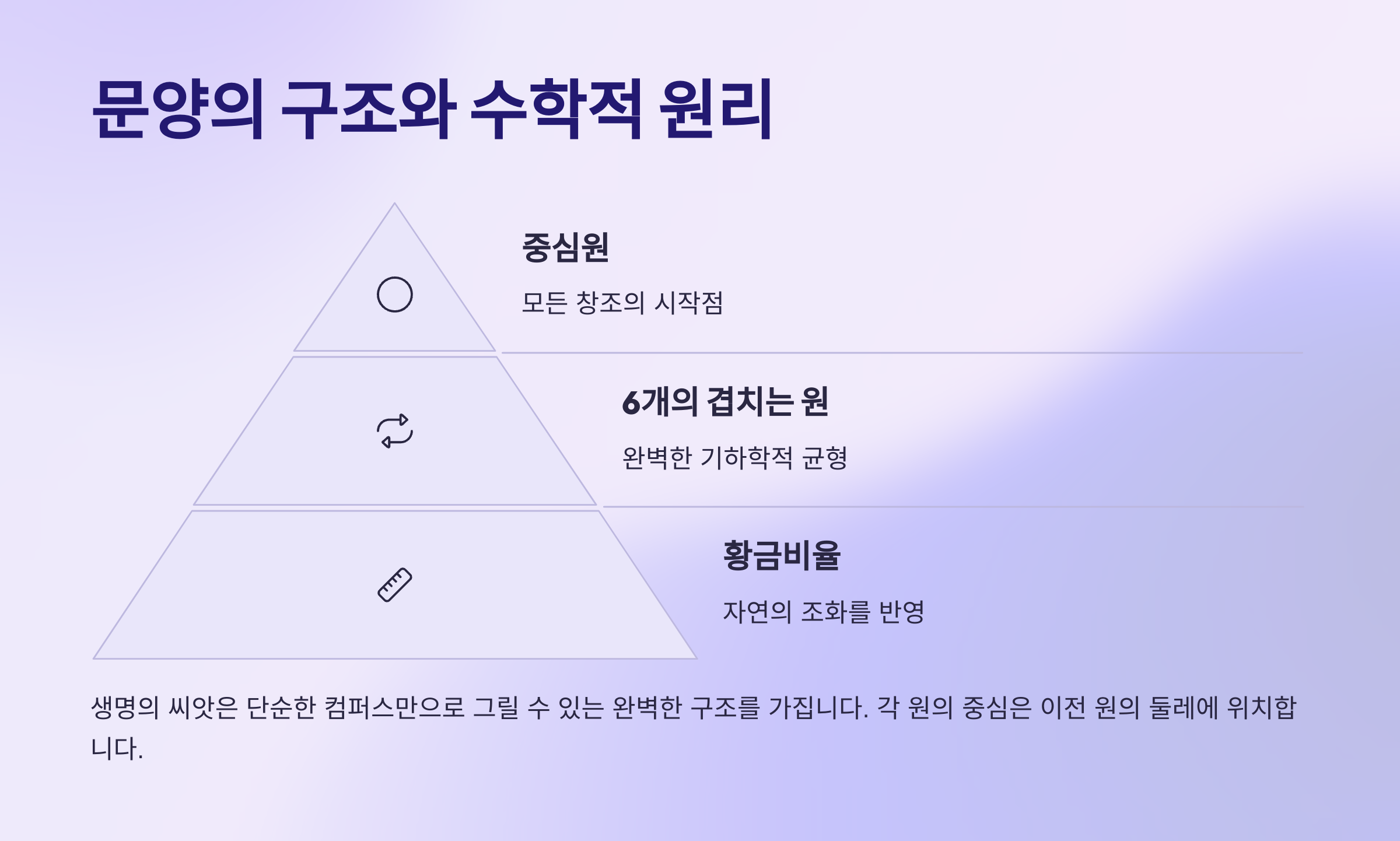 Seed of Life는 단지 시각적 아름다움만이 아닌, 수학적으로도 정교하게 설계된 구조입니다. 원과 원이 겹치는 이 도형은 기하학적으로 황금비율, 대칭성, 원의 분할 구조 등을 포함하고 있어, 수학적 조화의 상징으로 간주됩니다. 특히 이 문양은 플라톤의 입체 도형, 피보나치 수열과도 연관된 구조를 보여주며, 물리적 우주의 구성 원리를 상징하기도 합니다.