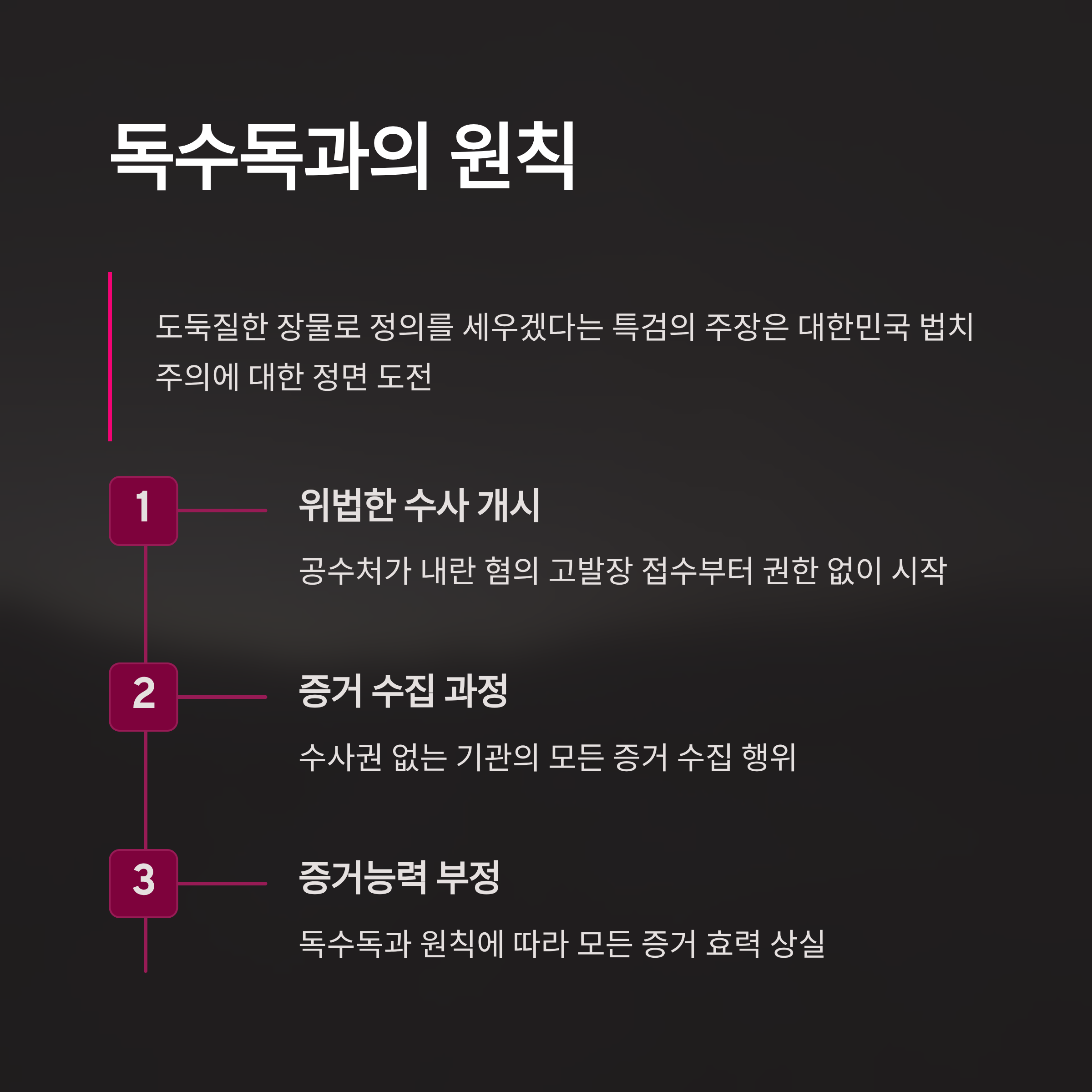 특검은 '직권남용을 수사하다 내란 혐의를 인지했다'고 변명하지만, 변호인단은 공수처가 처음부터 내란 혐의 고발장을 접수해 수사를 개시했다는 '팩트'를 제시하며 반박했습니다. 시작부터 위법한 수사로 얻은 증거들은 재판에서 어떠한 효력도 가질 수 없습니다. 이는 '독수독과(毒樹毒果)의 원칙'에 따라 명백히 증거능력이 부정되어야 합니다. 도둑질한 장물로 정의를 세우겠다는 특검의 주장은 대한민국 법치주의에 대한 정면 도전입니다.