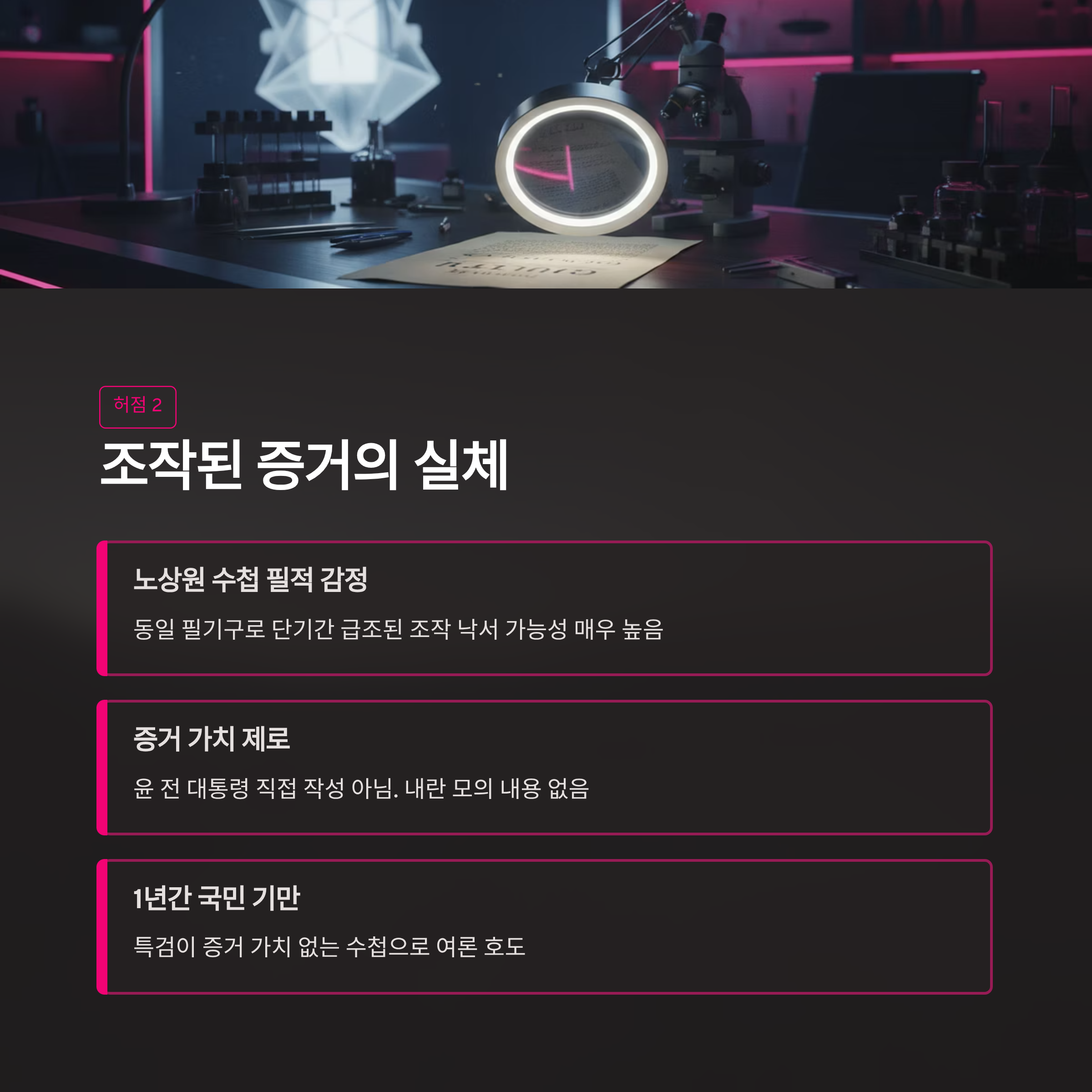 특검이 핵심 증거로 제시한 '노상원 수첩'은 필적 감정 결과 단기간에 급조된 조작된 낙서 수준에 불과하다고 폭로했습니다.